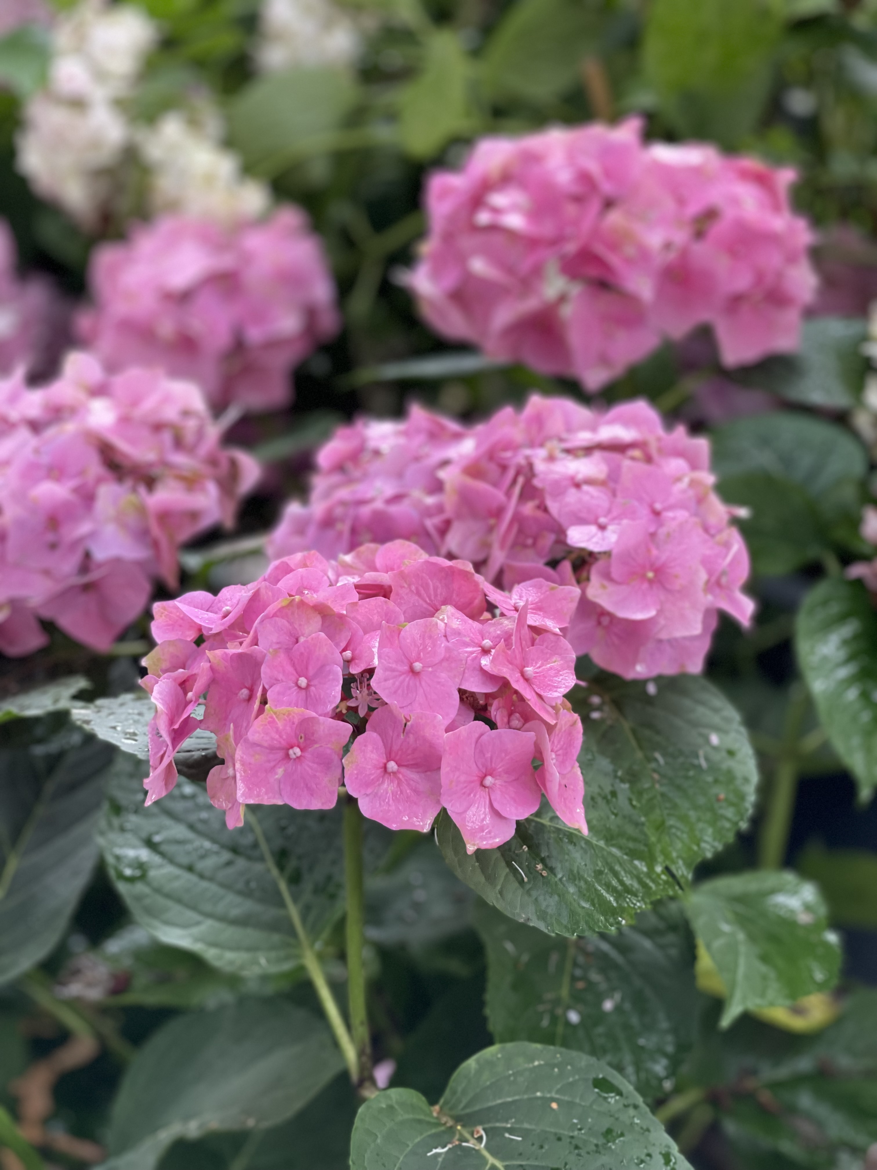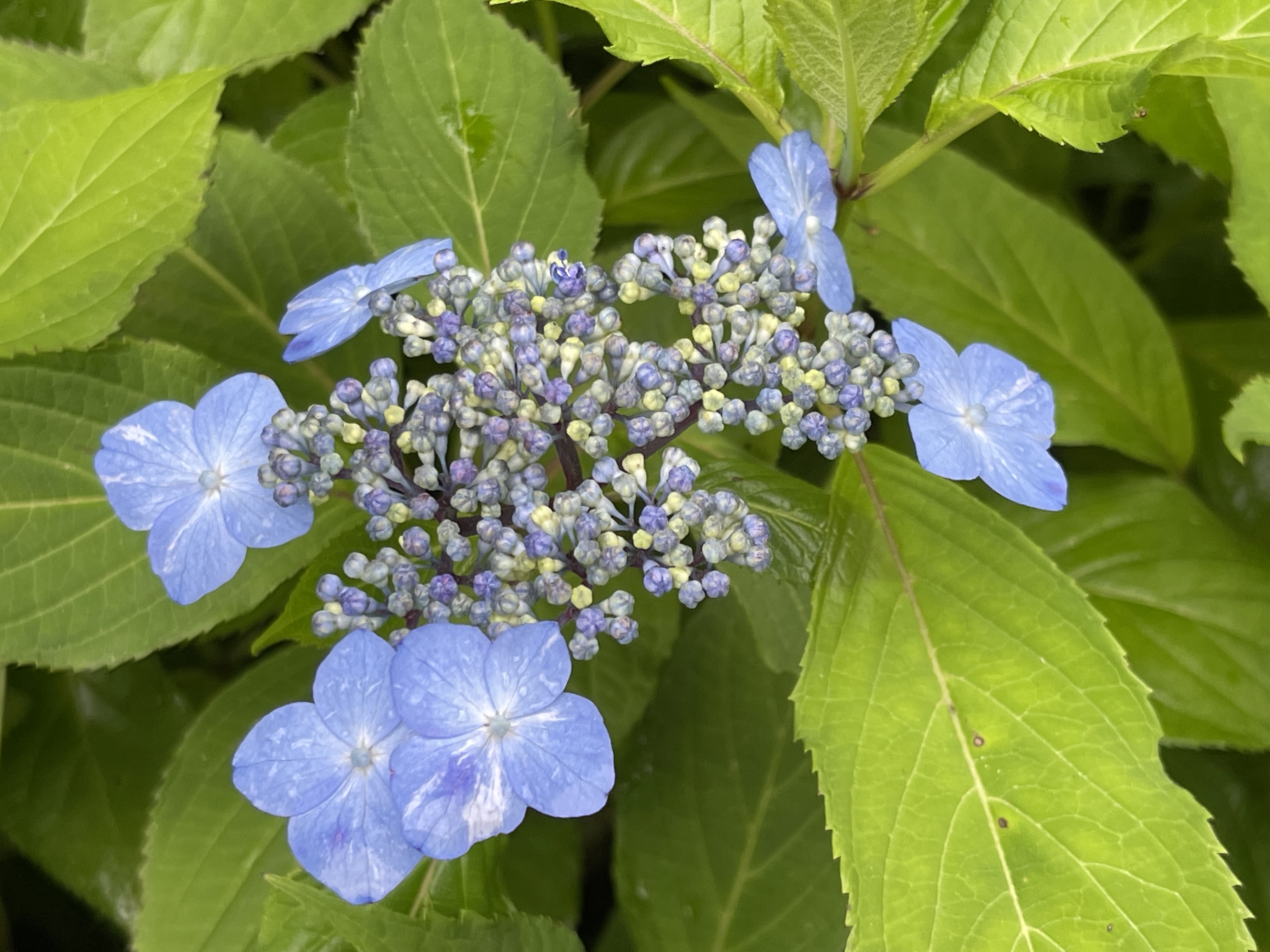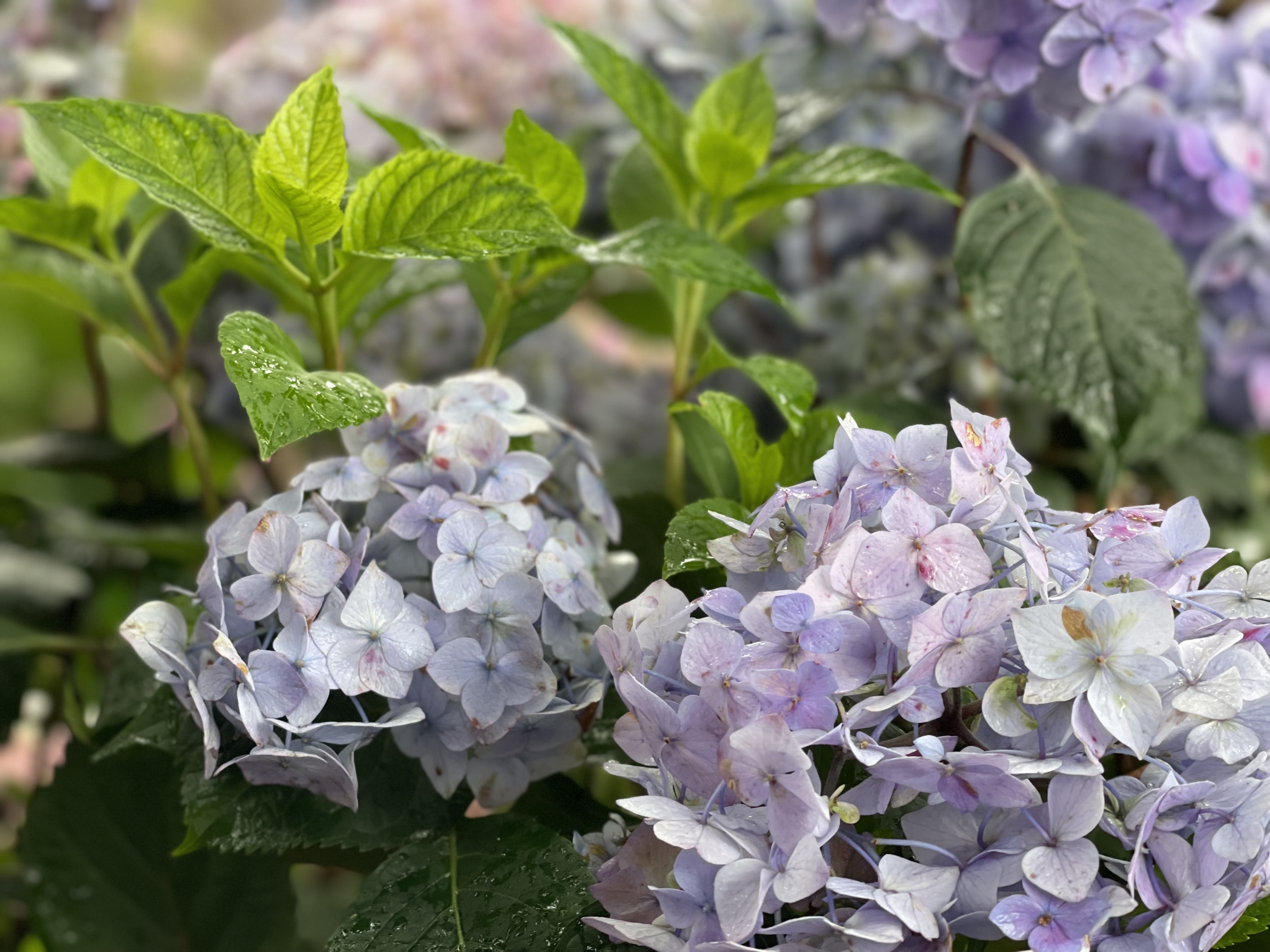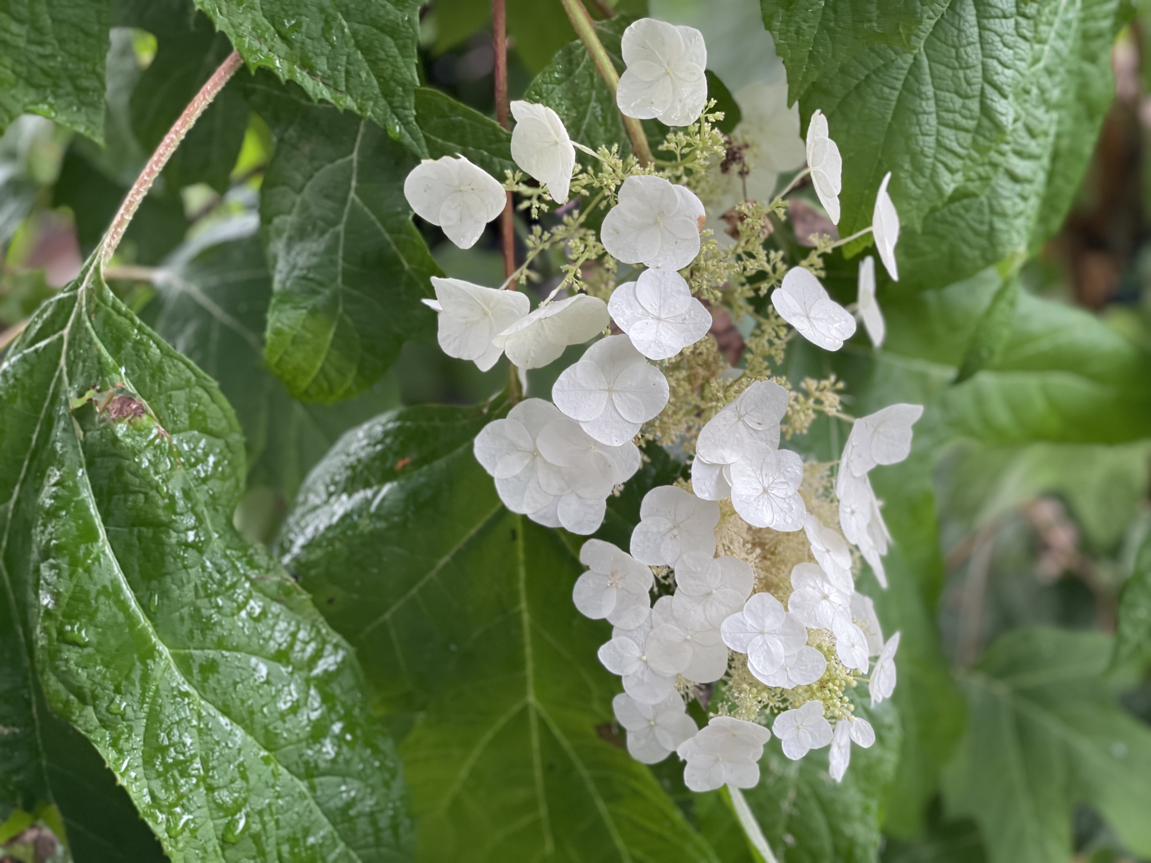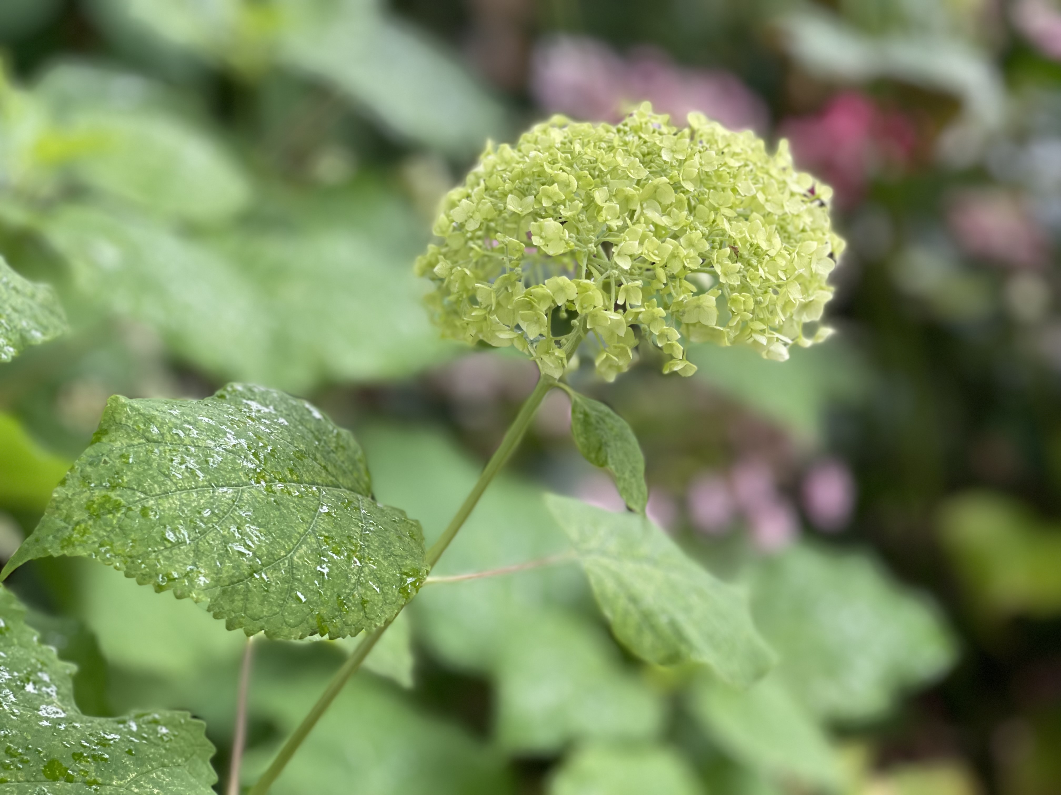 잎은 약간 두꺼운 편이며 매끄럽고 광택이 나서 겨울에도 그대로 있을 것 같지만 가을에 잎을 떨굽니다. 수국은 물을 좋아 합니다.