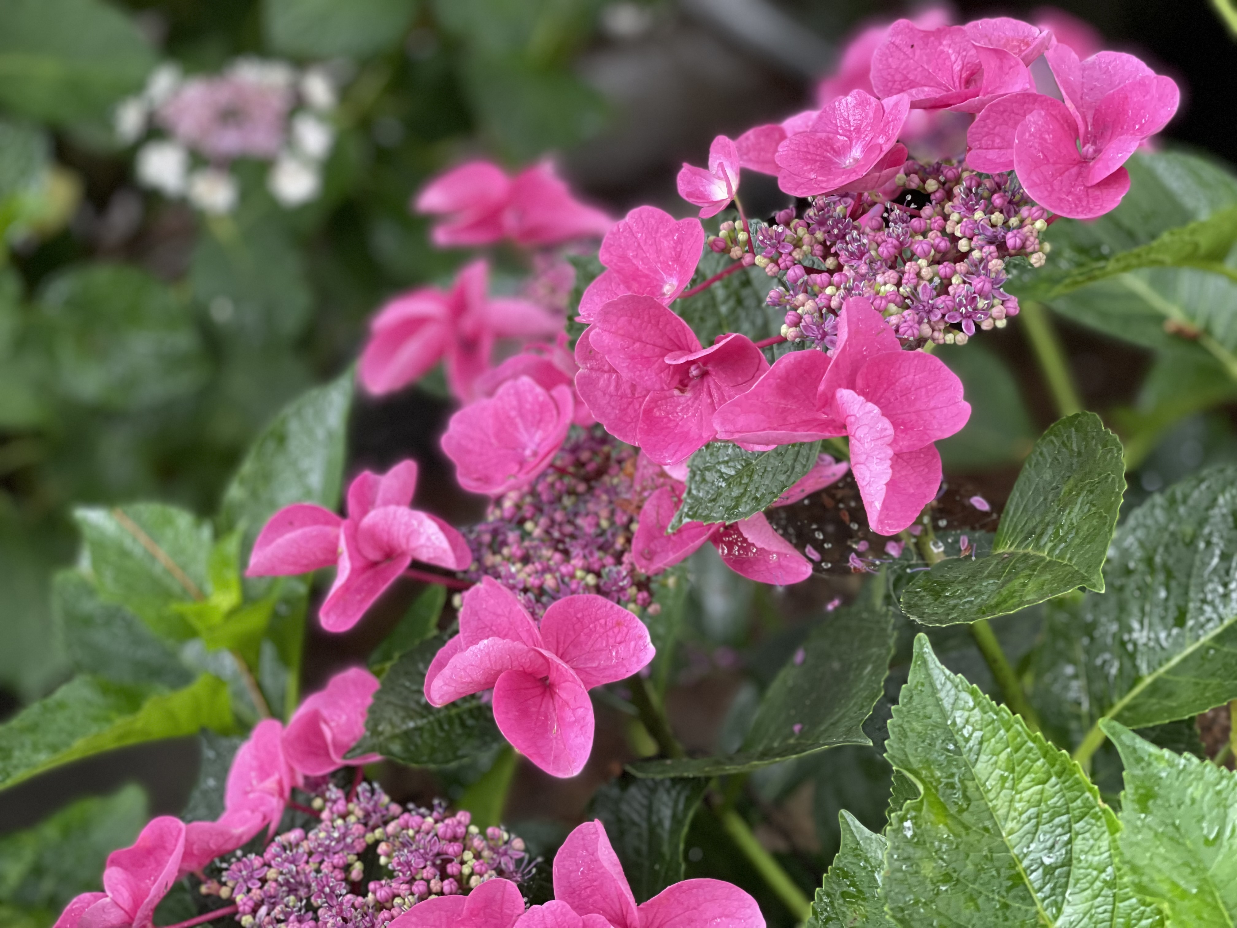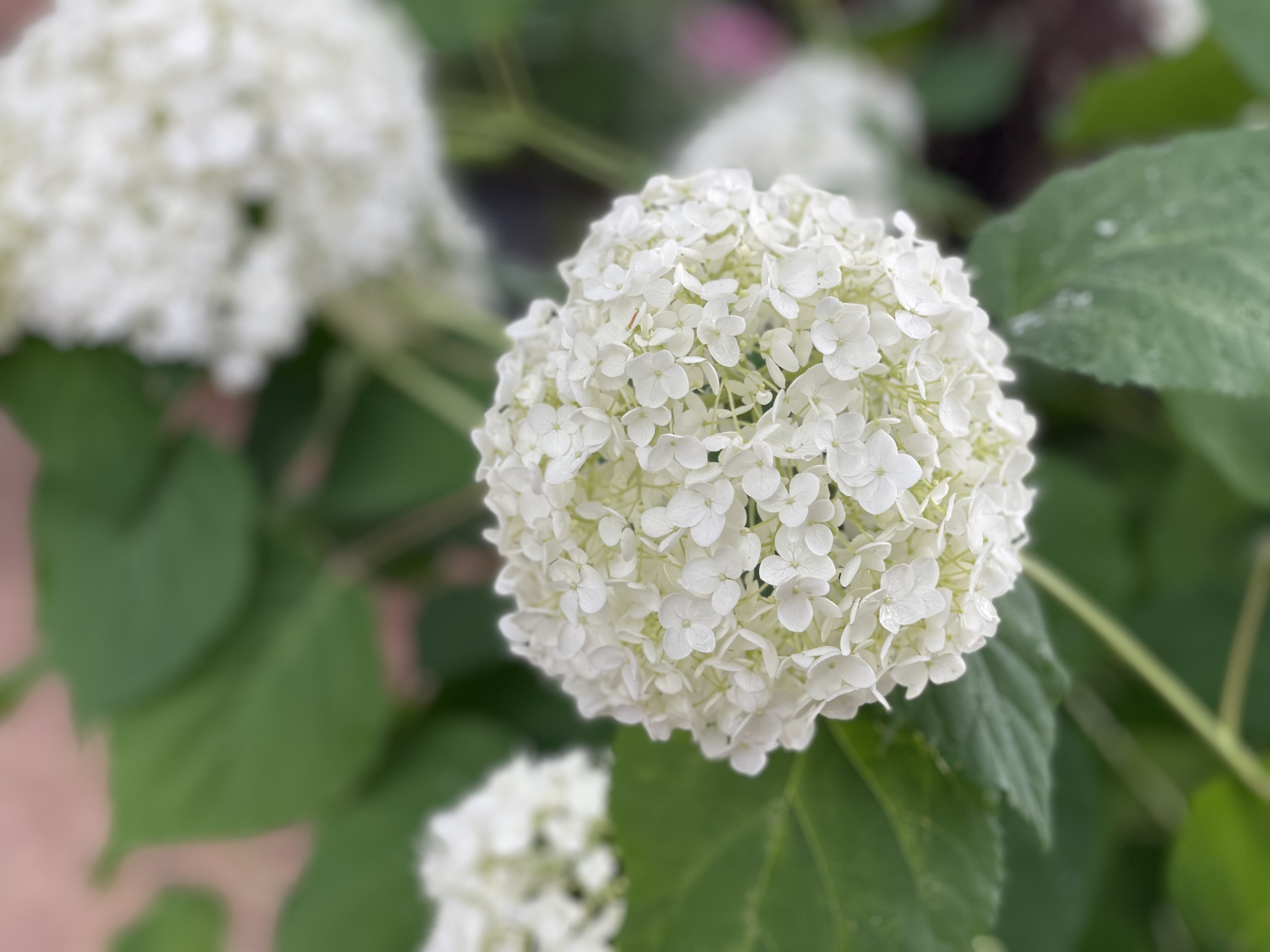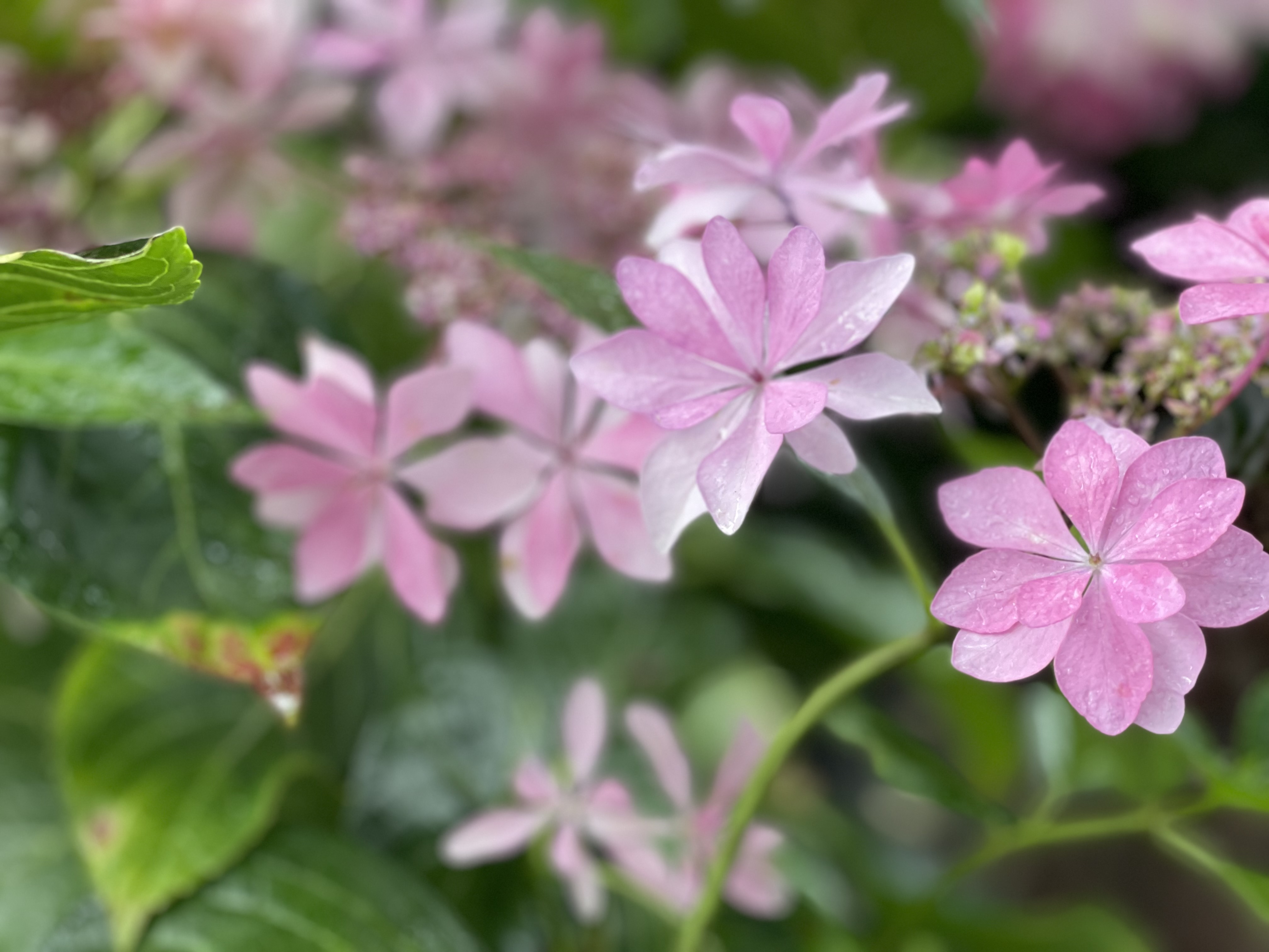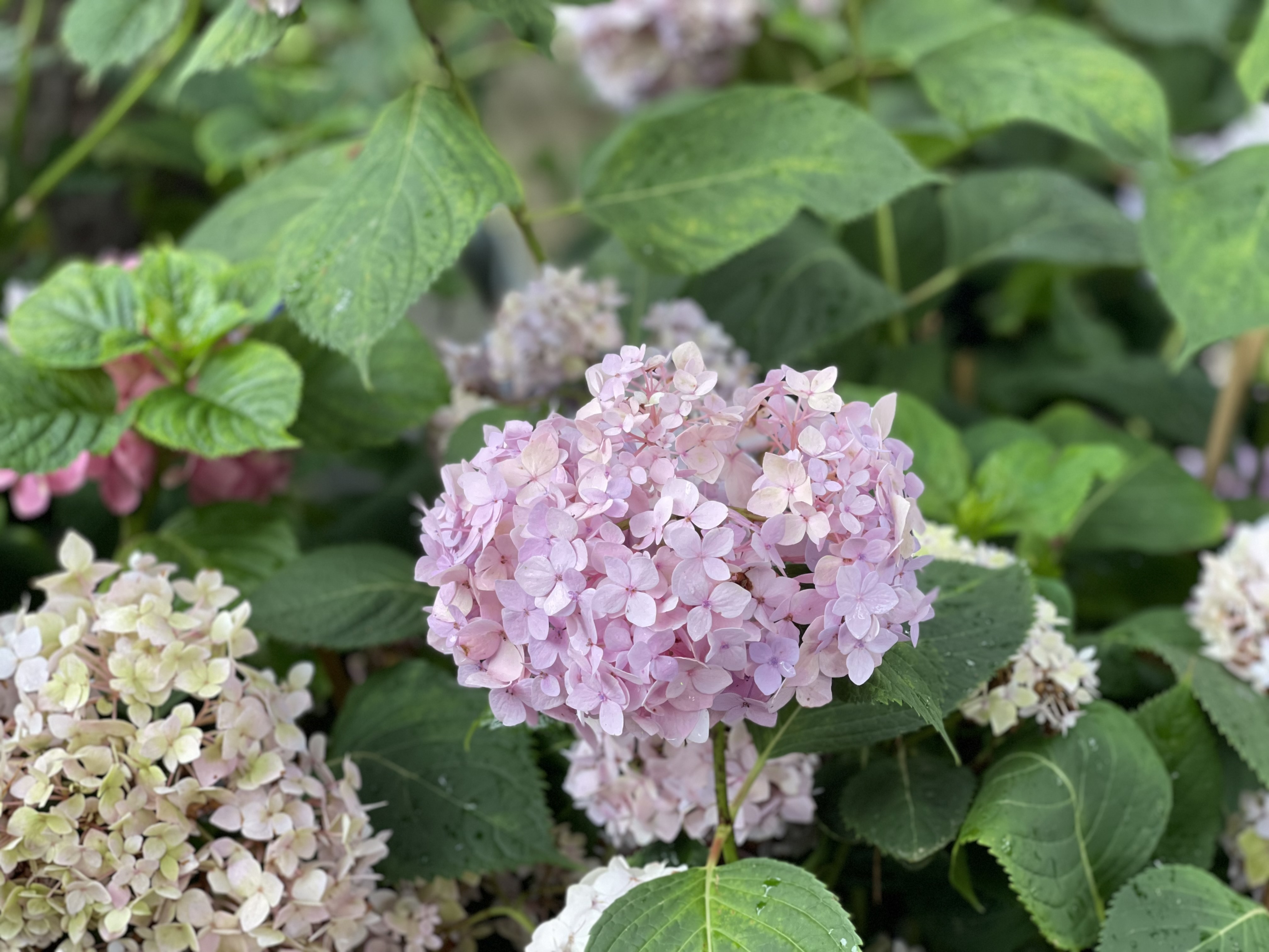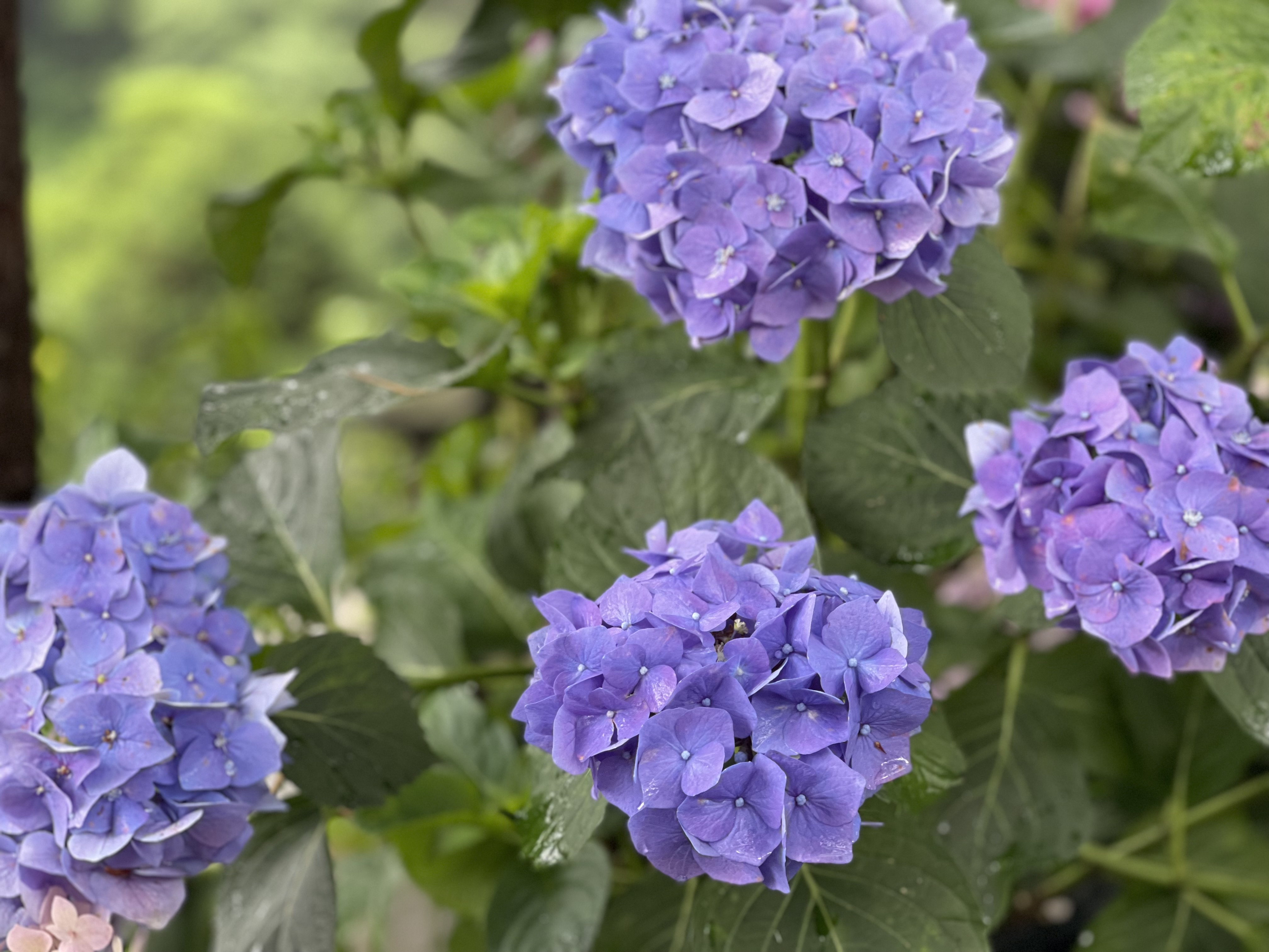 잎은 약간 두꺼운 편이며 매끄럽고 광택이 나서 겨울에도 그대로 있을 것 같지만 가을에 잎을 떨굽니다. 수국은 물을 좋아 합니다.