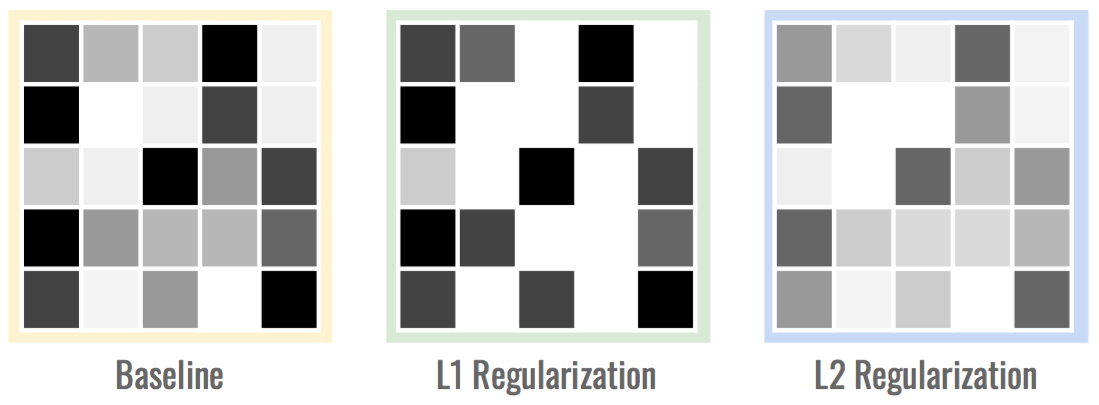 무게 행렬은 다음과 같습니다. L1 행렬이 많은 0으로 희박하고, L2 행렬이 약간 더 작은 가중치를 갖는 방법에 유의하십시오.