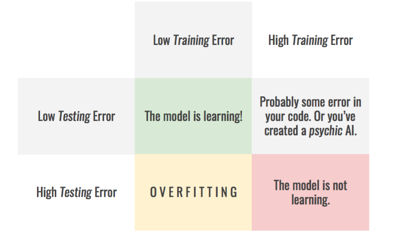 이러한 분할을 통해 각 세트의 모델 성능을 점검하여 교육 프로세스가 어떻게 진행되고 있는지 파악하고 교육 프로세스가 발생할 때 오버핏을 찾아낼 수 있습니다. 다음 표에서는 여러 가지 사례를 보여 줍니다.