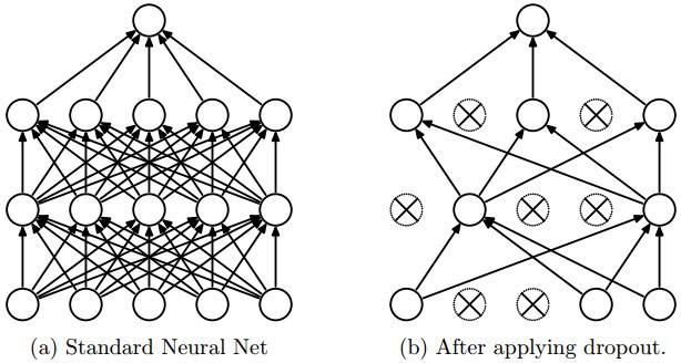 이 매우 효과적인 기술은 딥러닝에 특화되어 있는데, 이는 신경망이 한 계층에서 다음 계층으로 정보를 처리한다는 사실에 의존하기 때문이다. 이 아이디어는 훈련 중에 뉴런(드롭아웃) 또는 연결(드롭커넥트) 중 하나를 임의로 비활성화하는 것입니다.