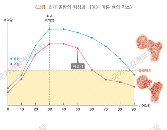 여성은 폐경기를 거치면서 여성 호르몬이 급격히 감소하게 되는데, 이 때 뼈의 감소가 나타납니다. 폐경 후 여성은 폐경이 나타난 후 5~10년 내에 급격히 뼈가 약해지게 됩니다.