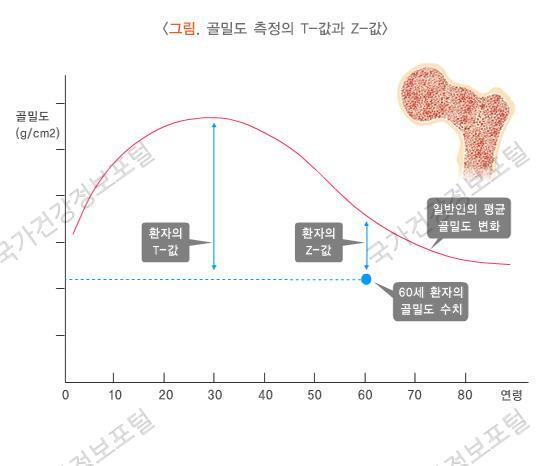 골밀도를 판정할 때는 측정된 절대값을 사용하기보다는 T-값과 Z-값을 주로 사용합니다. T-값은 동일한 성별에서 젊은 성인 집단의 평균 골밀도와 비교하여 표준편차로 나타낸 값으로, 건강한 젊은 성인과의 차이를 의미합니다. Z-값은 같은 연령대의 성인들과의 골밀도 평균치와의 차이를 의미합니다.