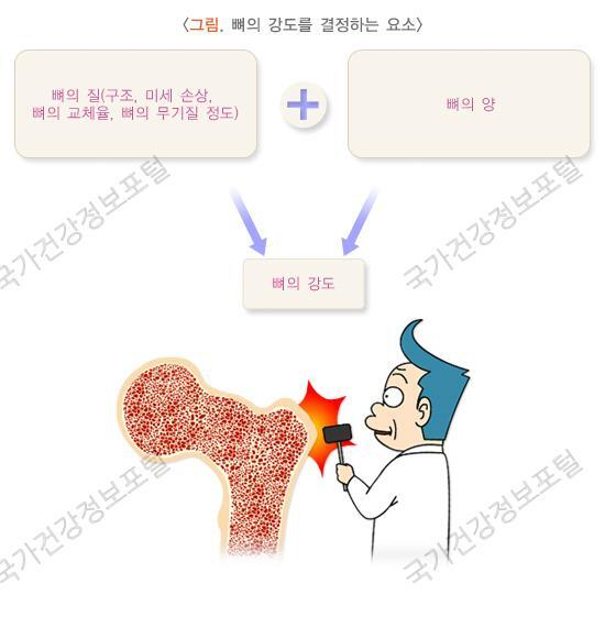 뼈에는 뼈를 생성하는 조골세포와 뼈를 파괴시키는 파골세포가 존재합니다. 뼈의 양이 증가되고 감소되는 것은 뼈에 존재하는 두 세포의 기능에 의하여 좌우됩니다. 뼈를 파괴하는 세포의 기능이 뼈를 생성하는 세포의 기능보다 과도한 경우에는 뼈의 양이 감소하게 됩니다. 또는 뼈를 만드는 세포의 기능이 떨어져서 뼈 파괴를 충분히 보충할 수 없을 때에도 뼈의 양이 감소합니다.