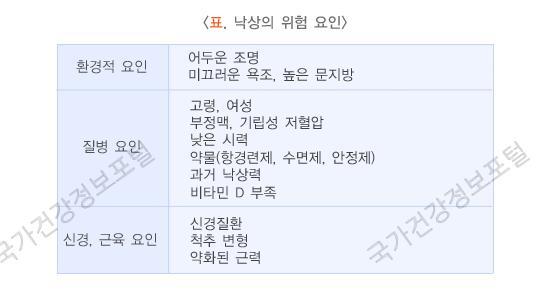 골절의 발생 기전에서 나타난 것처럼 낙상은 골절 발생의 중요한 요인입니다. 낙상의 위험 요소로 알려진 것은 아래의 표와 같습니다.