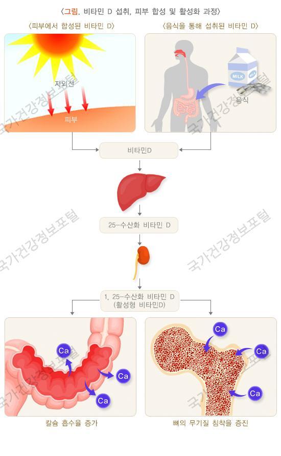 비타민D는 식이를 통한 섭취와 자외선에 의한 피부 합성을 통해 체내로 공급되며 간과 신장을 거치면서 활성형 비타민D가 되어 장에서 칼슘의 흡수를 증가시키고 뼈의 무기질 침착에 중요한 역할을 합니다. 비타민D가 결핍되면 뼈가 약해지는 골연화증이 발생됩니다.