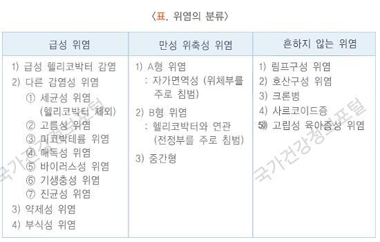 이외에 우리나라에서 흔히 경험하는 급성 위염의 원인으로는 생선회 섭취 후 발생하는 아니사키스 감염이나 강산 또는 강알칼리 용액으로 인한 부식성 위염을 빠뜨릴 수 없습니다.
