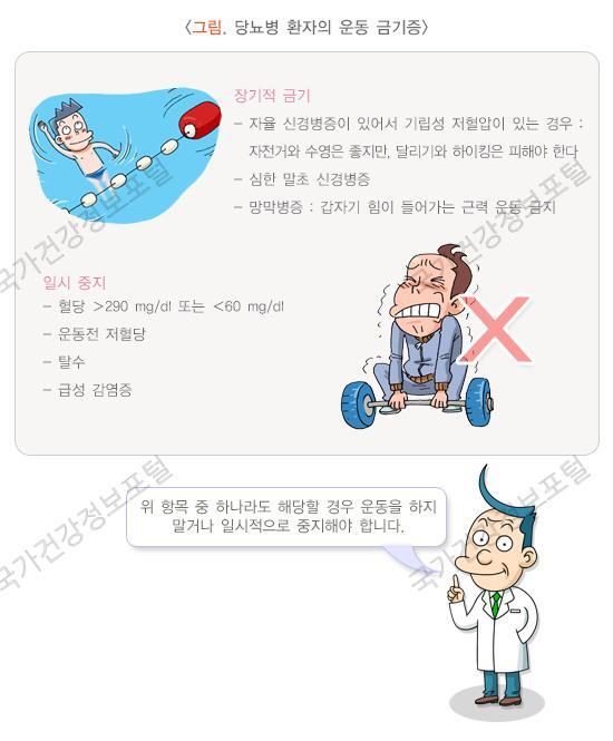 당뇨병의 만성 합병증이 있다면 주치의와 상의하여 합병증의 정도에 따라 운동량을 결정하셔야 합니다.