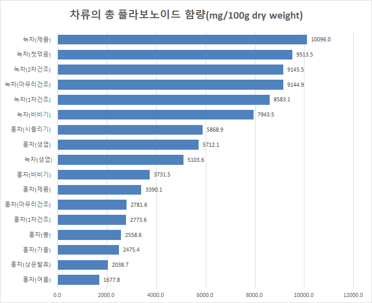 이번에는 차류(녹차,홍차)의 플라보노이드 함유량을 보고자 합니다.
