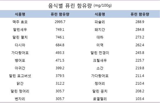 통풍이나 신(콩팥)결석 또는 고요산혈증 환자는 요산을 생성하는 '퓨린'이라는 단백질 섭취에 주의해야 한다.