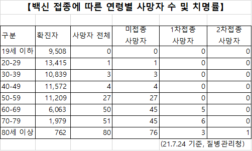 【백신 접종에 따른 연령별 사망자 수 및 치명률】