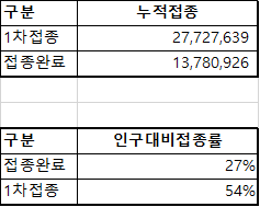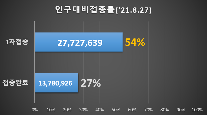8.27일까지 1차 접종은 2770만이 넘어서 54%이며, 접종완료된 인구는 1370만으로 27%입니다.