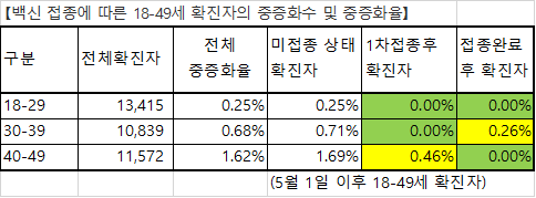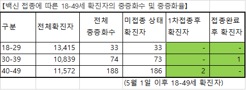 【백신 접종에 따른 18-49세 확진자의 중증화수 및 중증화율】