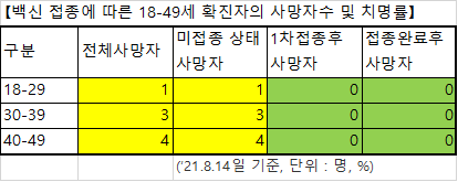 【백신 접종에 따른 18-49세 확진자의 사망자수 및 치명률】