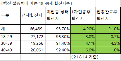 접종완료자 발생 시작 시점인 4월 3일부터 8월 14일까지 해당 연령대 확진자의 예방접종력을 분류한 결과 18~49세 확진자 중 93.7%가 미접종자, 4.2%가 불완전접종자, 2.1%가 완전접종자였습니다.