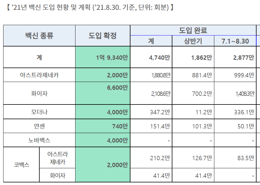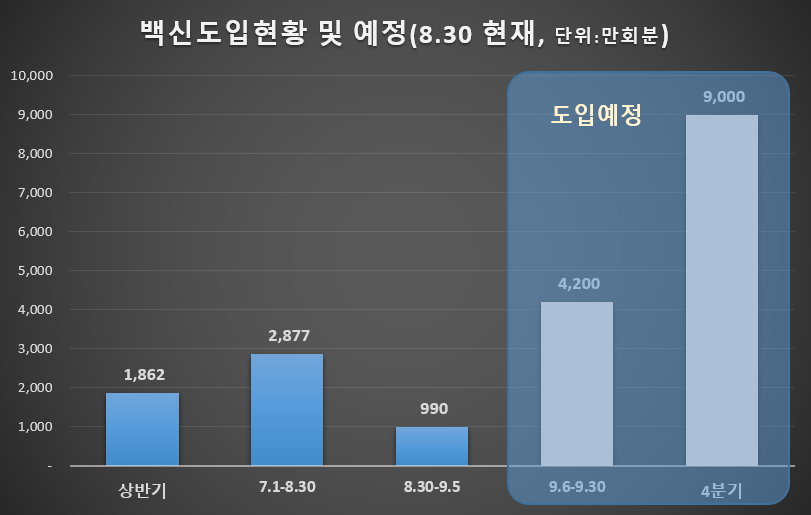 백신별 도입현황은 2021년 9월초에 많은 양이 도입될 예정입니다.