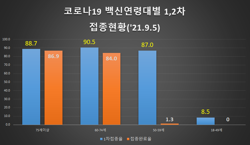 코로나19 백신연령대별 1,2차 접종현황('21.9.5)
