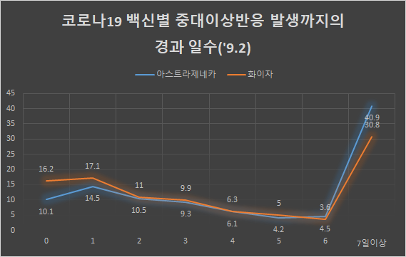 그래프를 보면 7일이 자나서 중대한 이상반응이 나타난 건수도 무려 전체 이상반응 의 30-40%에 육박합니다.