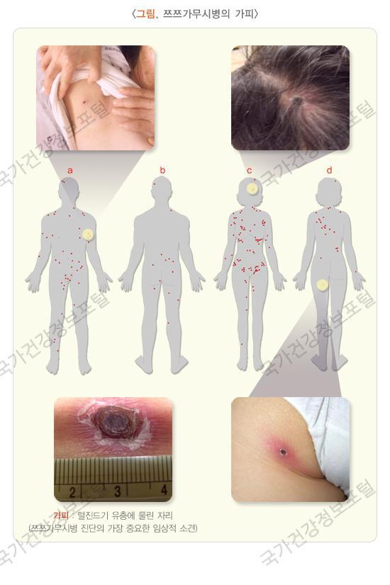 진드기에 물린 부위에 직경 5-20 mm가량의 가피가 형성되는데 이는 쯔쯔가무시병 진단에 가장 중요한 임상 소견입니다. 털 진드기에 물린 자리는 초기 구진에서 수포, 궤양을 거쳐 검은색 가피로 덮이고 가피 주변은 붉은색 홍반으로 둘러싸이는데 증상이 나타날 때쯤이면 전형적인 가피가 형성됩니다. 가피는 우리나라 쯔쯔가무시병 환자의 약 50-93%에서 관찰되며, 팬티 속, 겨드랑이, 오금 등 피부가 겹치고 습한 부위에 자주 생깁니다. 배꼽, 귓바퀴 뒤, 항문 주위, 머릿속 등 찾기 어려운 곳에 숨어있는 가피도 있으므로 철저한 신체검사가 필요합니다.