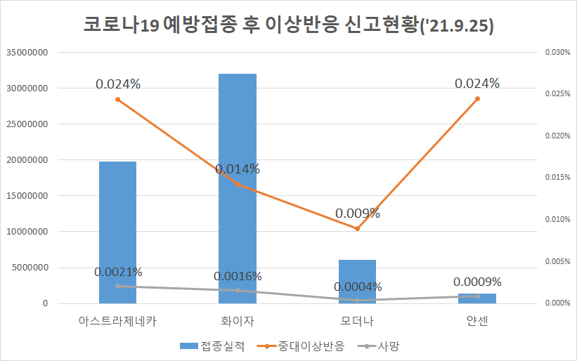 오늘은 '21.9.25일자 기준으로 질병관리청에서 발표한 코로나19 백신 예방접종 후 이상반응 신고현황을 분석해보고자 합니다.