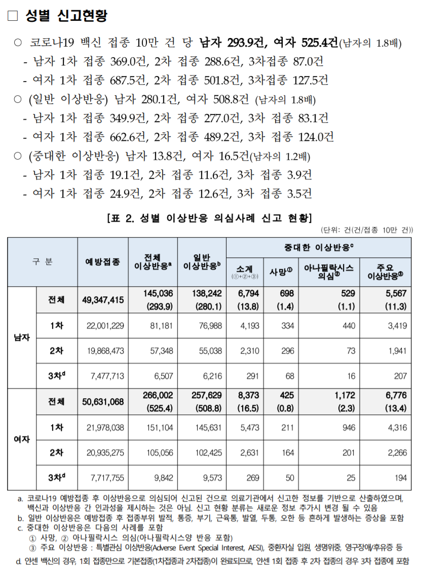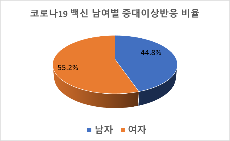 결론적으로 여자가 남자보다 더 중대이상반응이 많이 나타나는 것으로 나타났습니다.