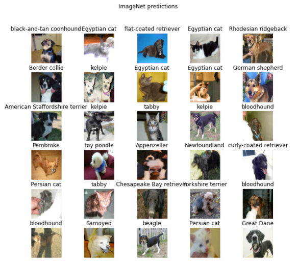 그 라벨은 개와 고양이의 이름과 일치하는 것 같다. 이제 Dogs vs Cats 데이터 세트의 이미지를 플롯하여 그 옆에 ImageNet 레이블을 붙입니다.