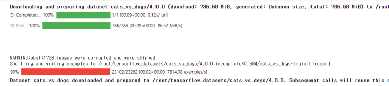 TensorFlow 데이터 세트를 사용하여 Dogs 대 Cats 데이터 세트를 로드할 수 있습니다.