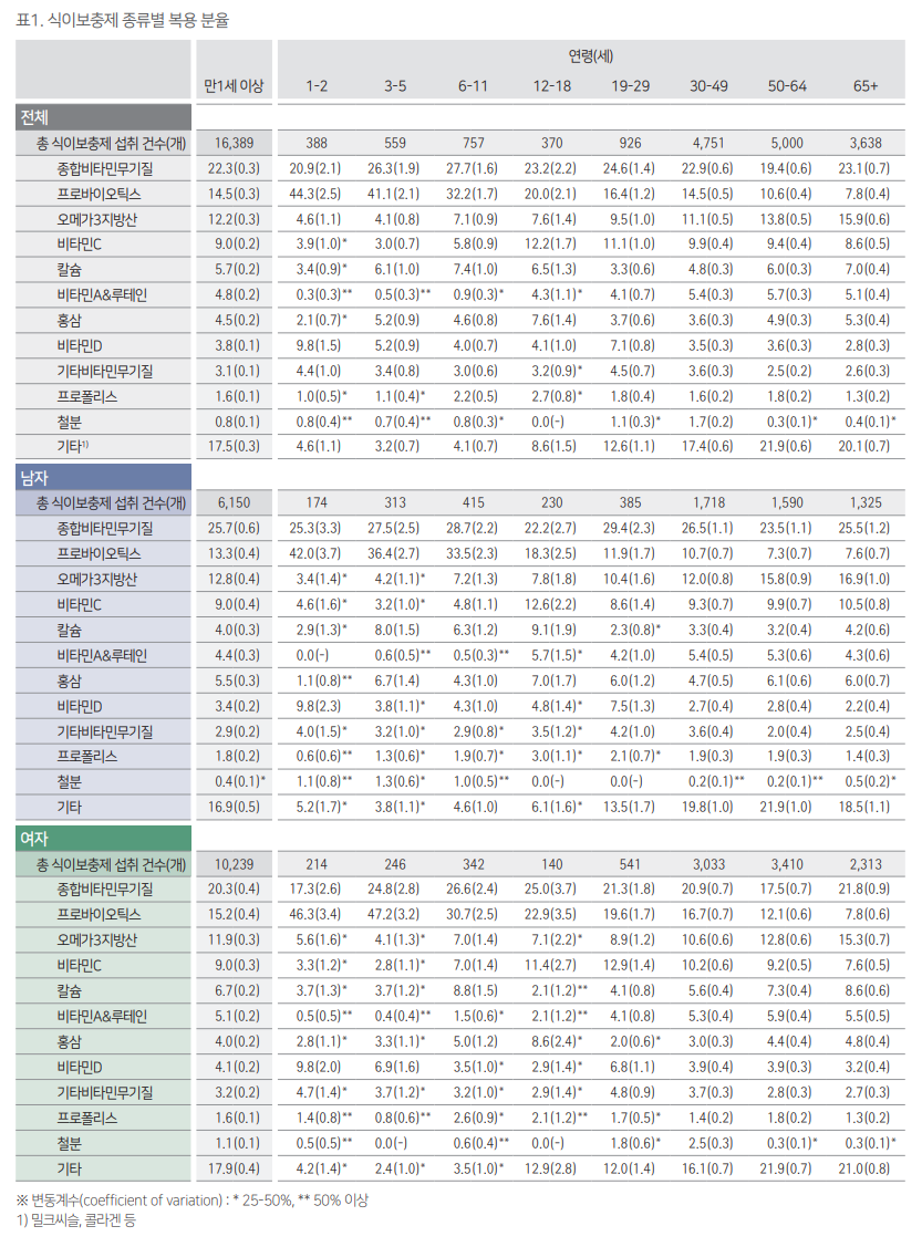 성별, 연령대별로 식이보충제의 섭취량의 순서가 차이가 납니다. 자신의 연령대에 맞추어서 한번 비교해봐 주세요.