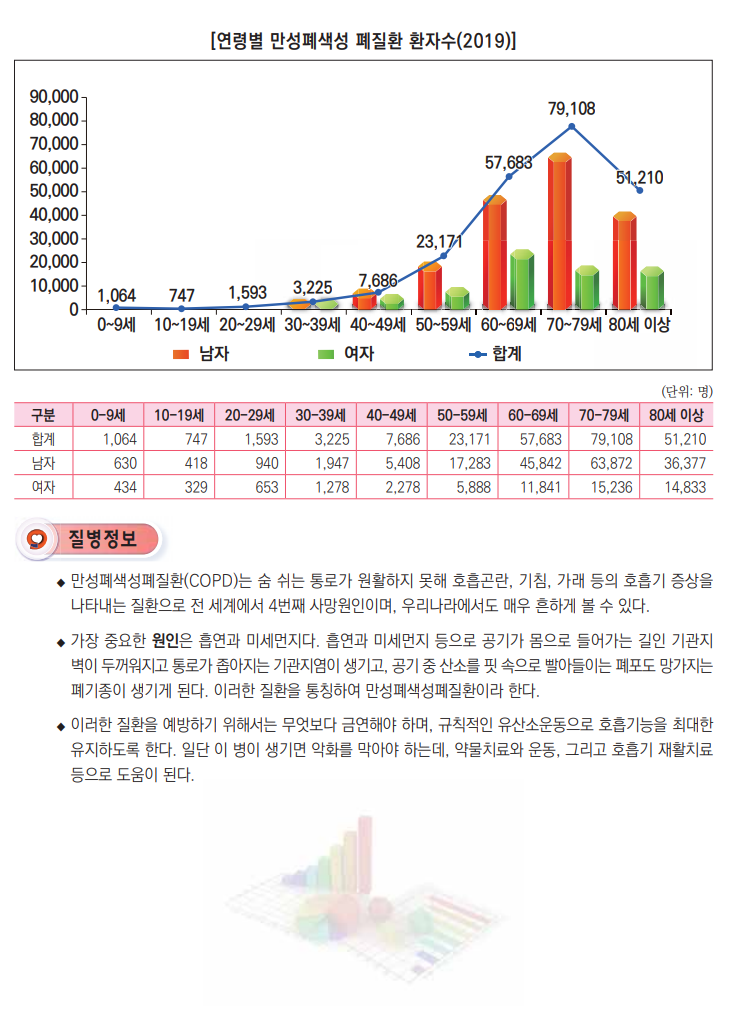 만성폐색성 폐질환은 담배 등에 의해 유발되는 진행성 폐 손상으로 기도와 폐조직이 서서히 손상되어 숨쉬기가 힘들어지는 질환입니다.