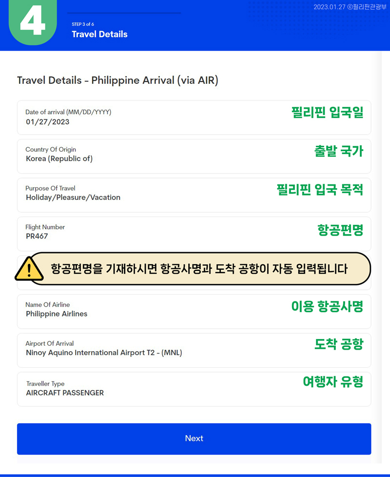 - ④ STEP 3 of 6. Travel Details - Philippine Arrival (via AIR): 필리핀 입국 목적 및 항공편명, 이용 공항 입력