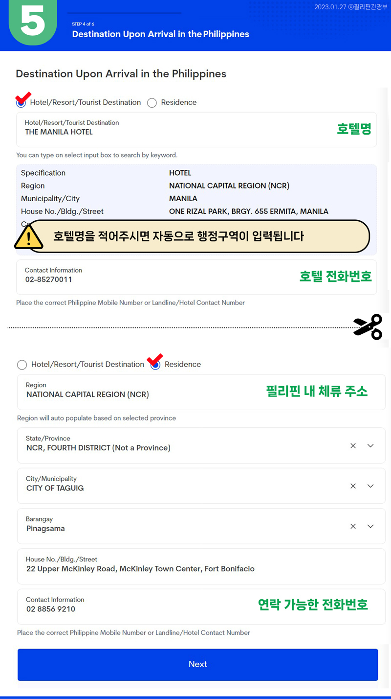 - ⑤ STEP 4 of 6. Destination Upon Arrival in the Philippines: 필리핀 내 체류 주소 입력