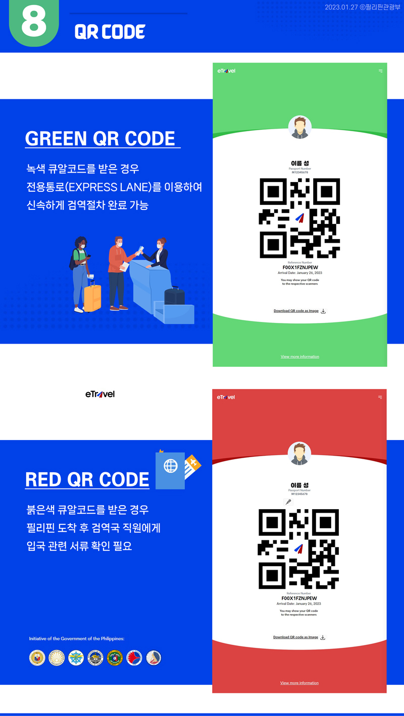 - - 녹색으로 큐알코드를 받은 경우(Green QR Code) : 필리핀 도착 후 전용통로(Express Lane)를 이용하여 신속하게 검역절차 완료 가능