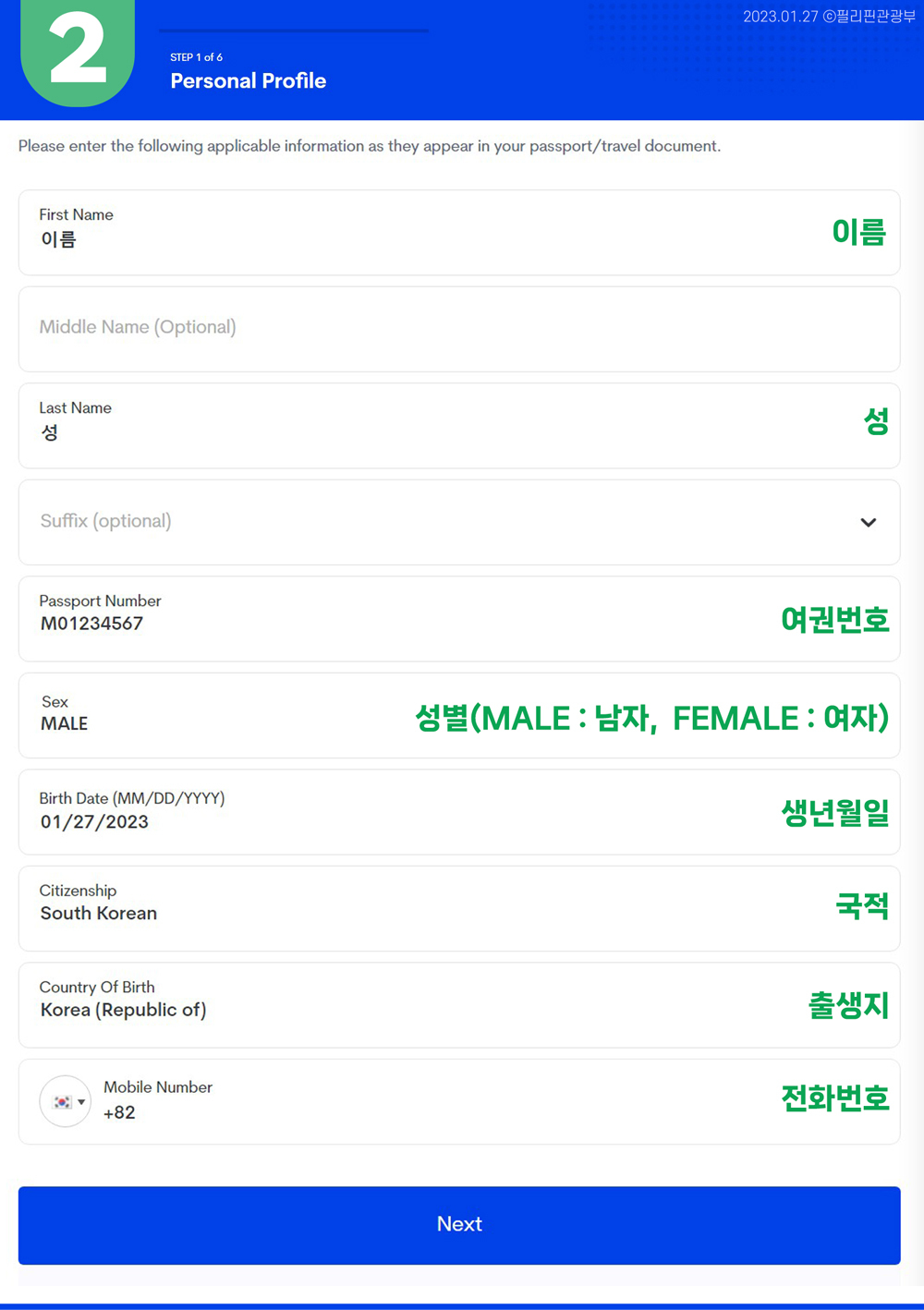 - ② STEP 1 of 6. Personal Profile: 이름, 여권번호, 성별, 국적, 출생지, 전화번호 입력