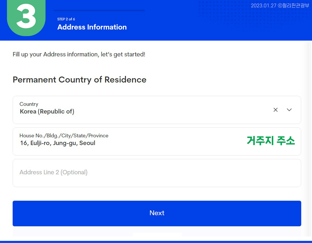 - ③ STEP 2 of 6. Permanent Country of Residence: 거주지 주소 입력