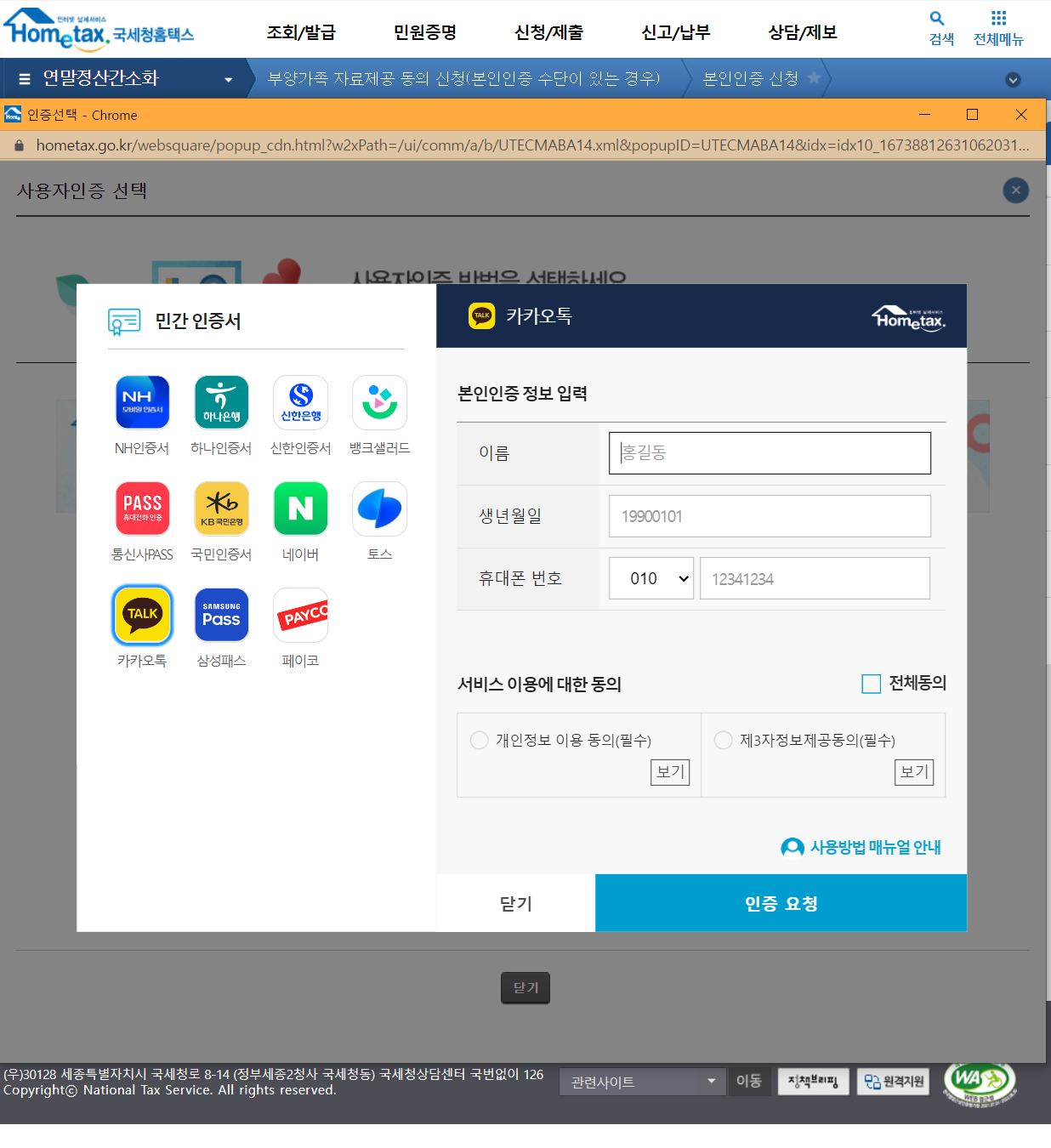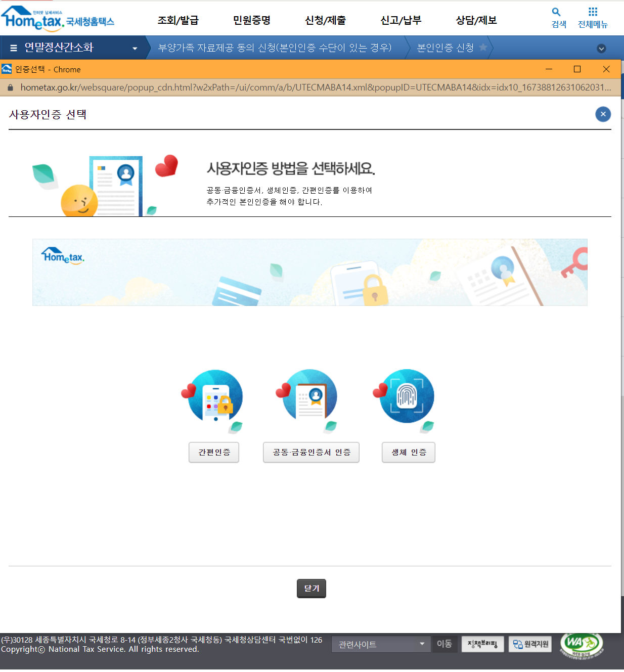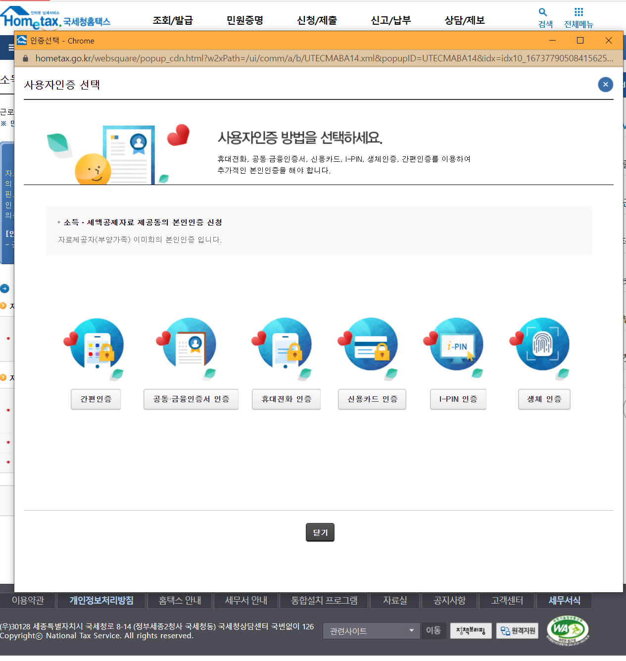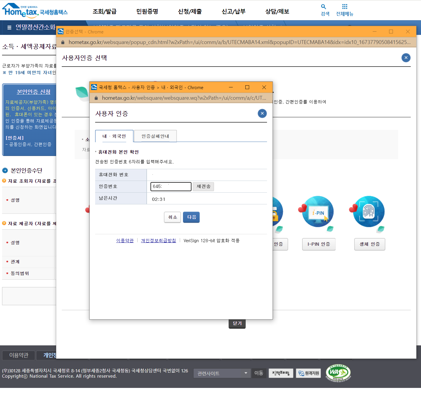 이제 공인인증서도 잘 안쓰는 시대가 되어서 국세청에서도 그냥 휴대전화인증을 통한 로그인을 제공합니다.