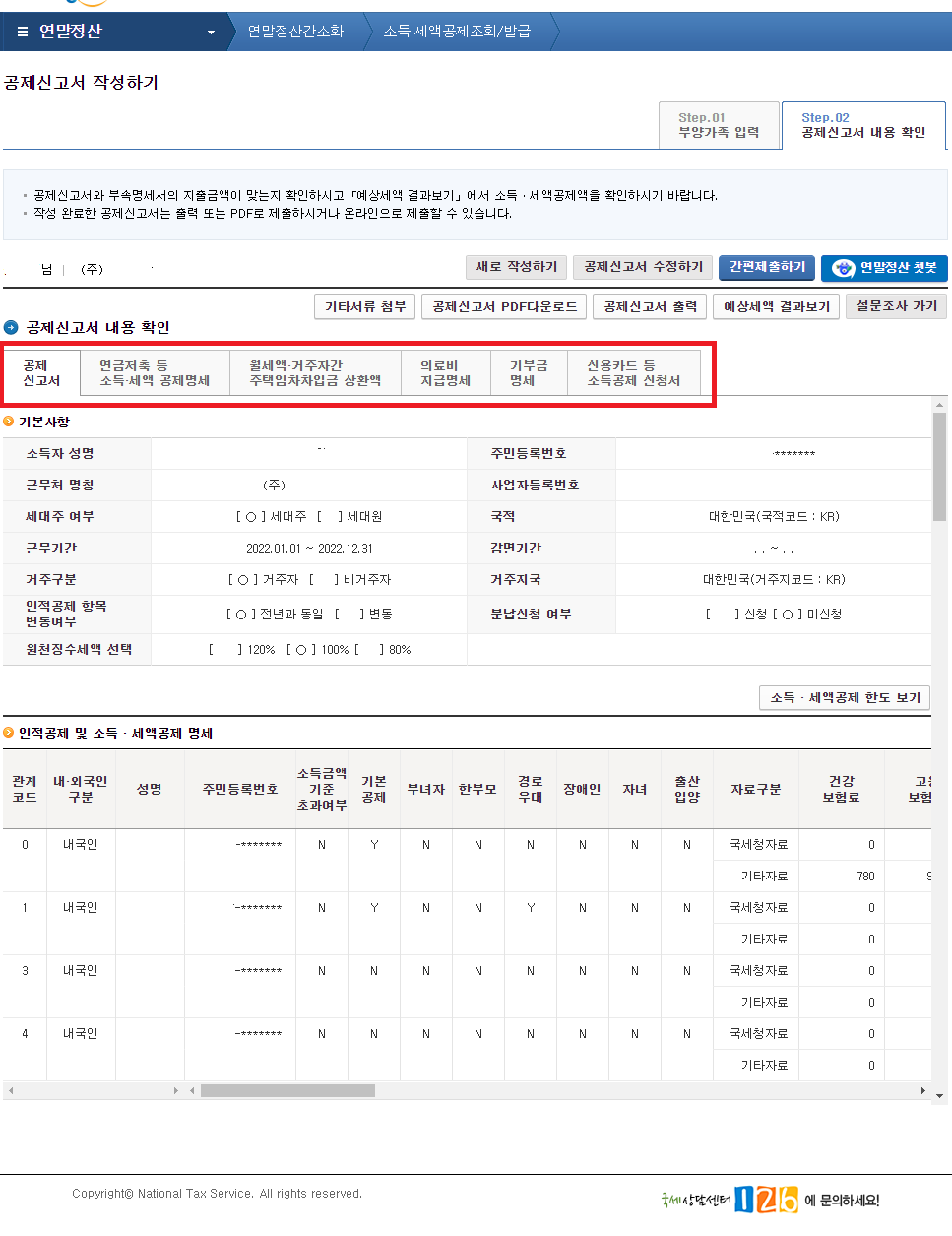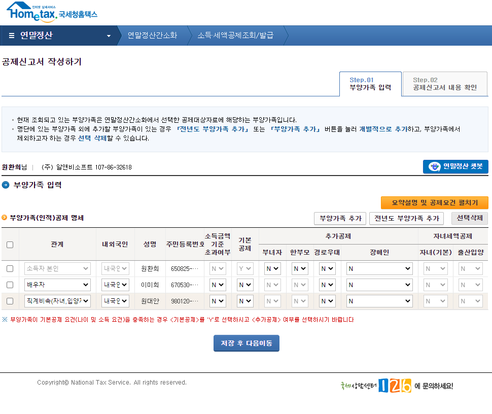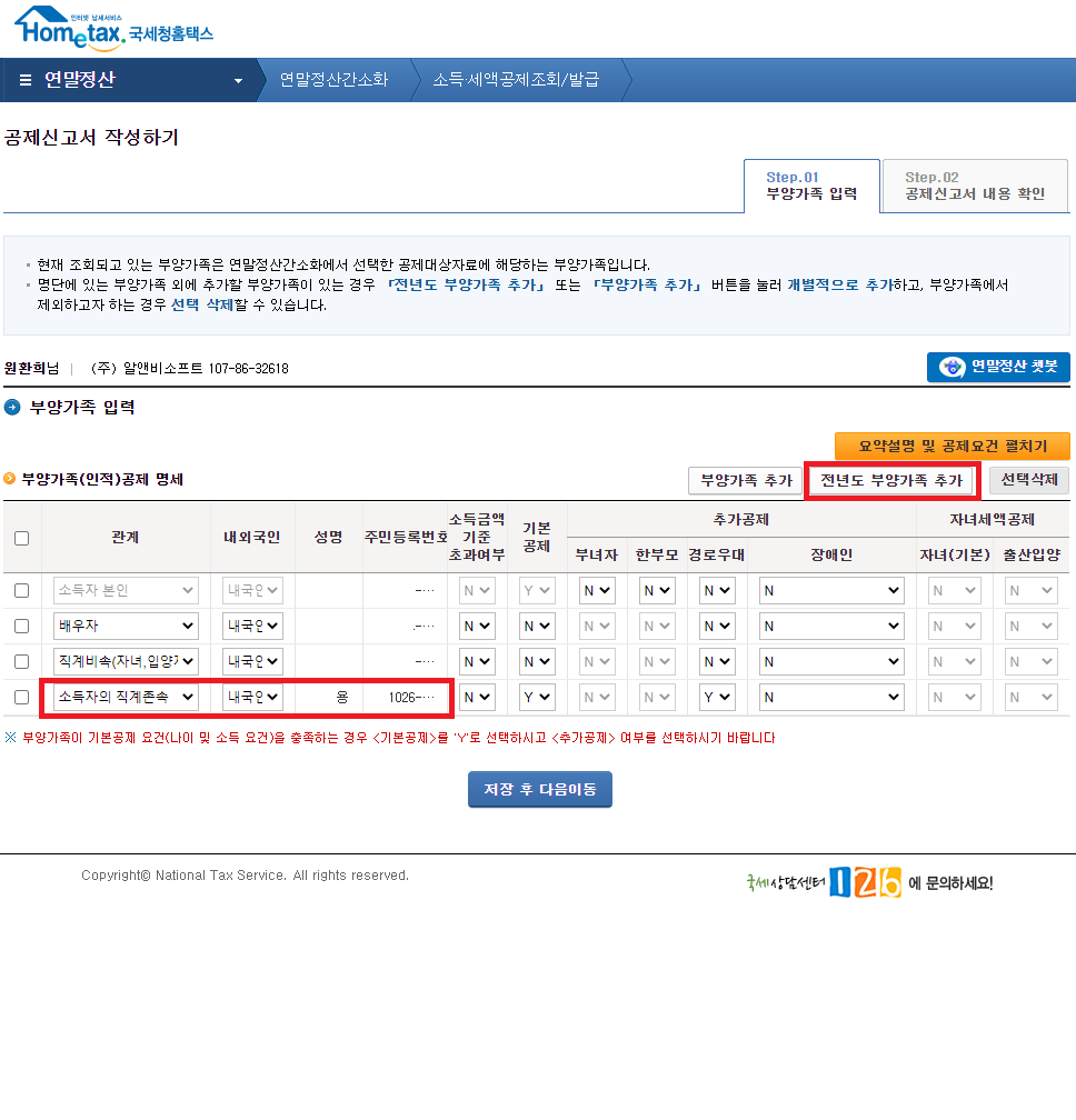 아래와 같이 전년도의 부양가족이 추가되어 표시됩니다.