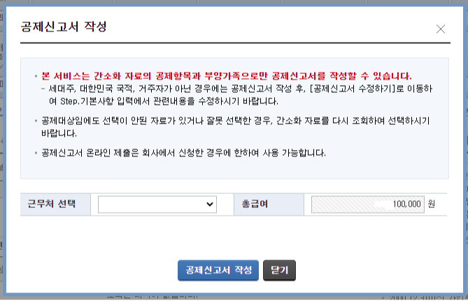 공제신고서 작성 팝업이 나옵니다.