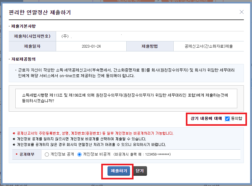 여기서 연말정산 부양가족 자료제공 동의를 누릅니다.