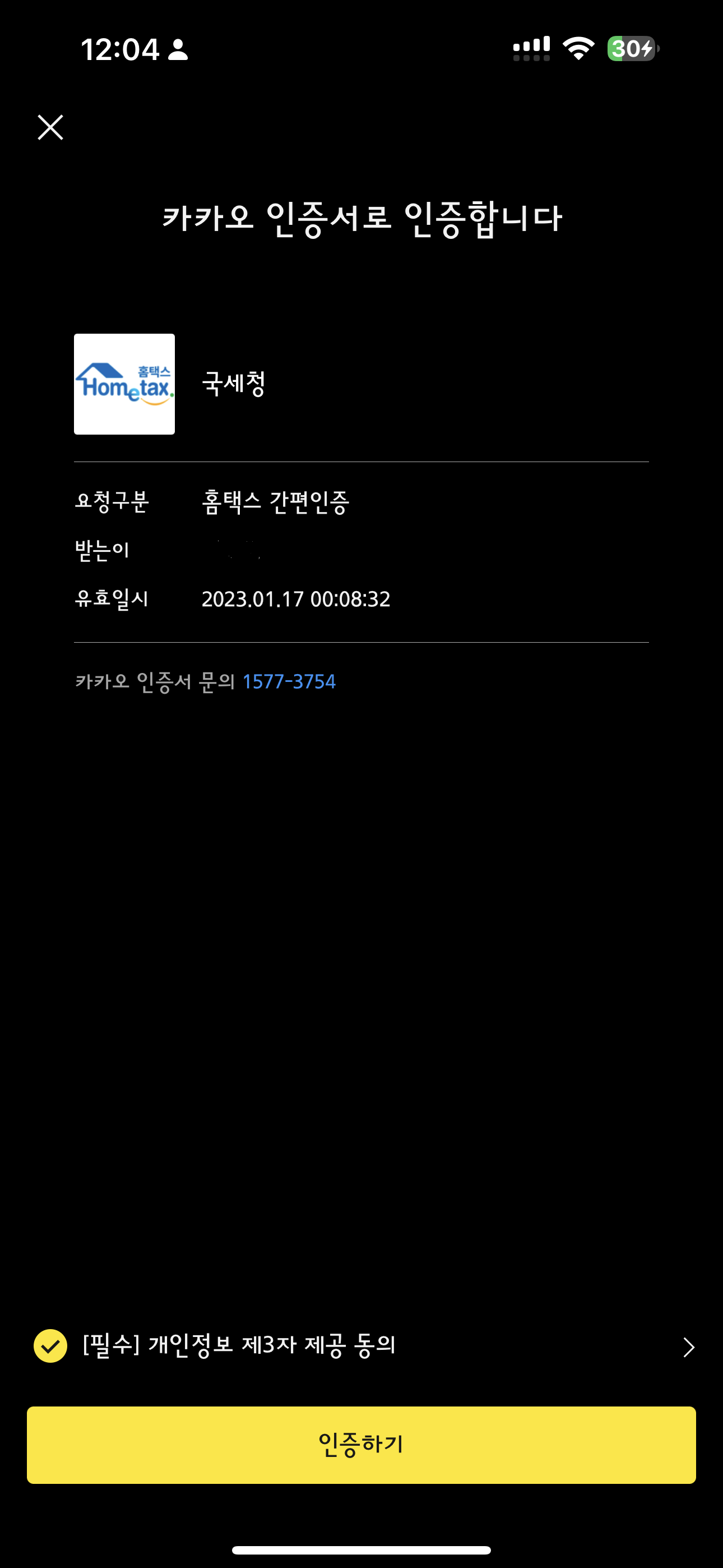 인증하기를 눌러서 인증을 진행합니다. 아래 그림처럼 제3자 제공동의를 체크한후 인증하기를 클릭합니다.