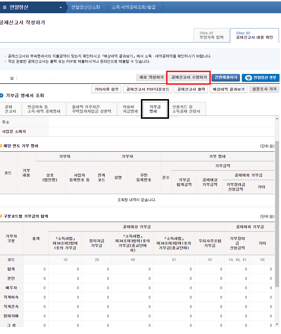 그런데 기부금이나 혹은 추가로 세금감면을 위한 자료를 별도록 확보한 경우에는 이 내용에 대하여 변경사항을 반영해야 하므로 수정하는 기능을 제공합니다.