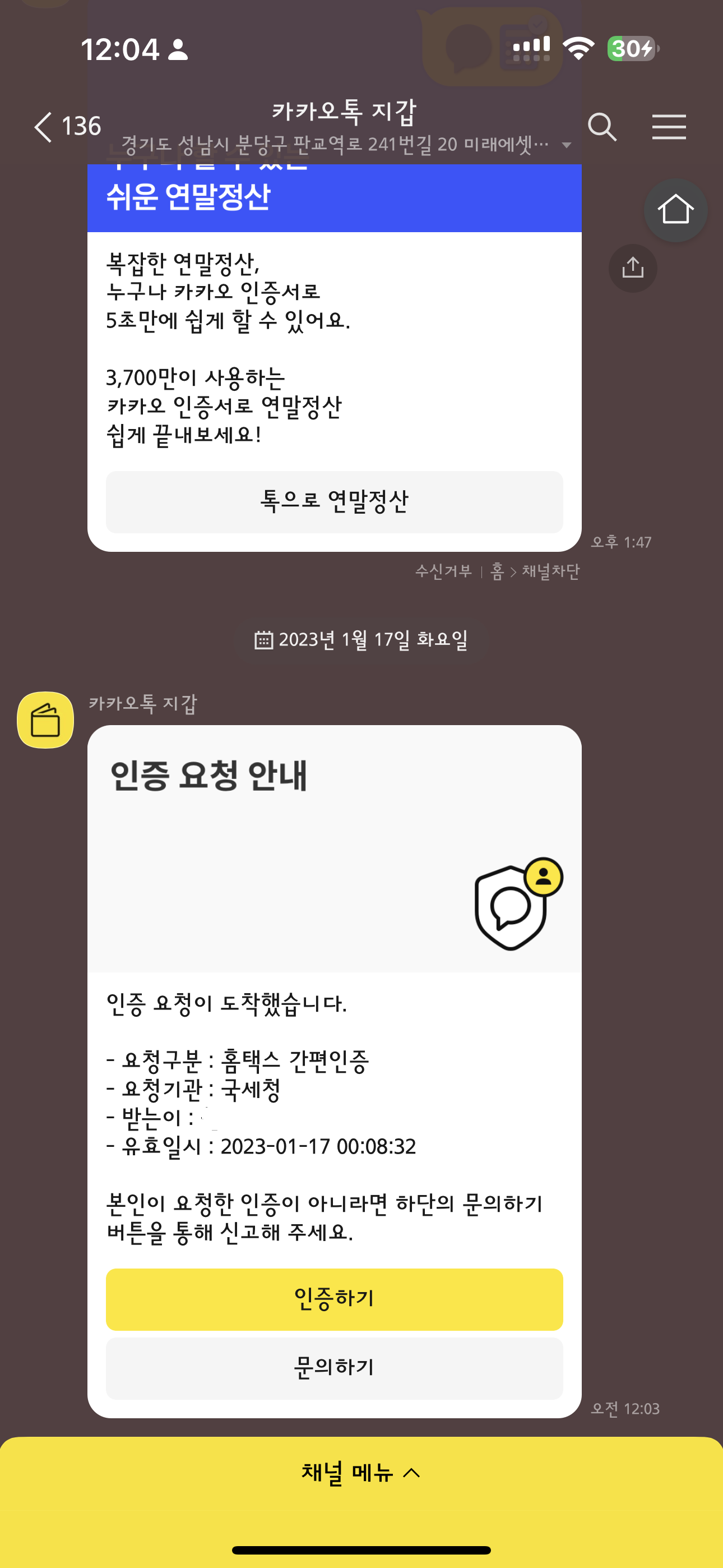 인증요청을 하면 카톡에서는 이렇게 나타납니다.