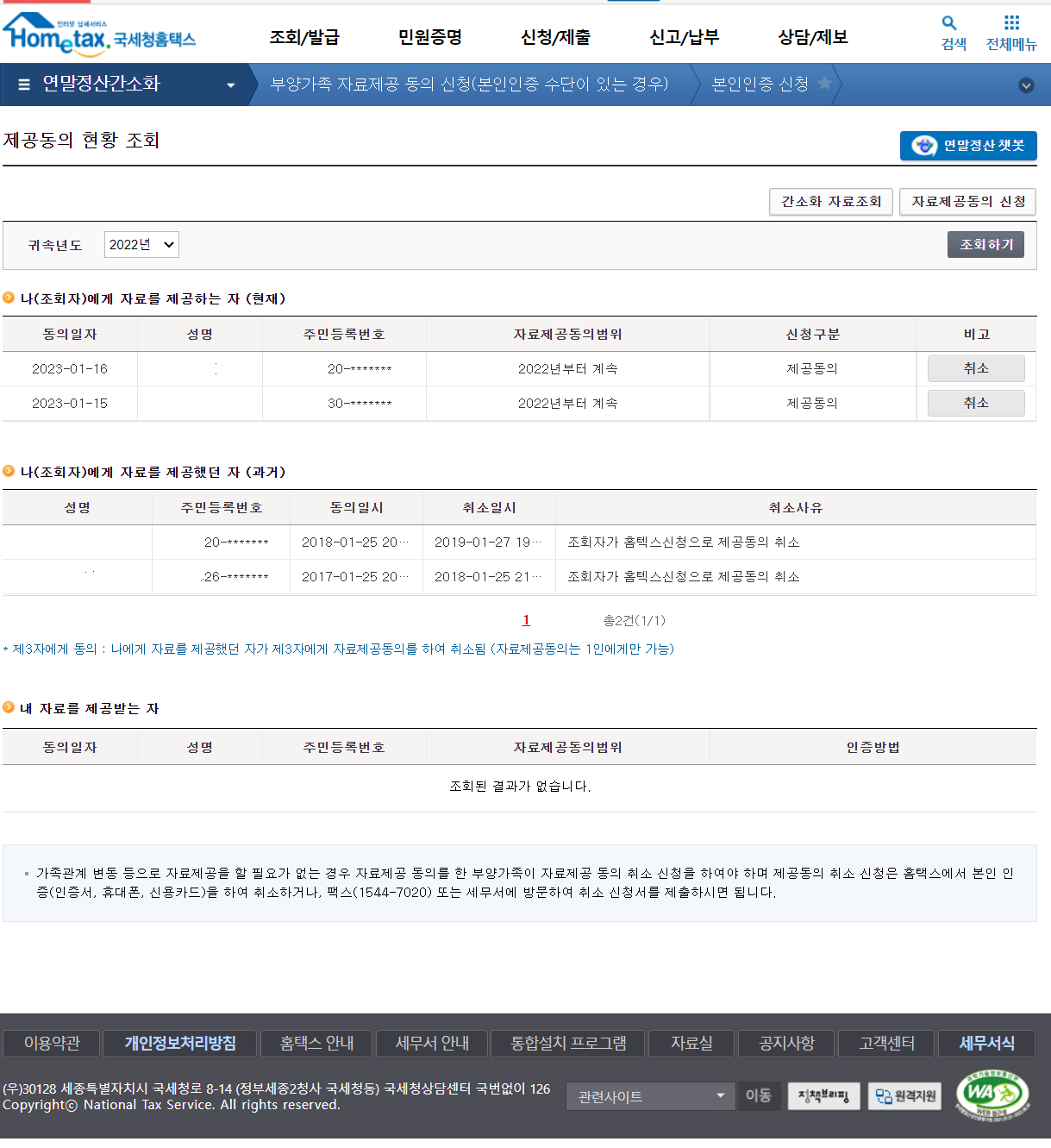 인증을 마치고, 국세청 홈피로 들어가면 제공동의현황이 보입니다.