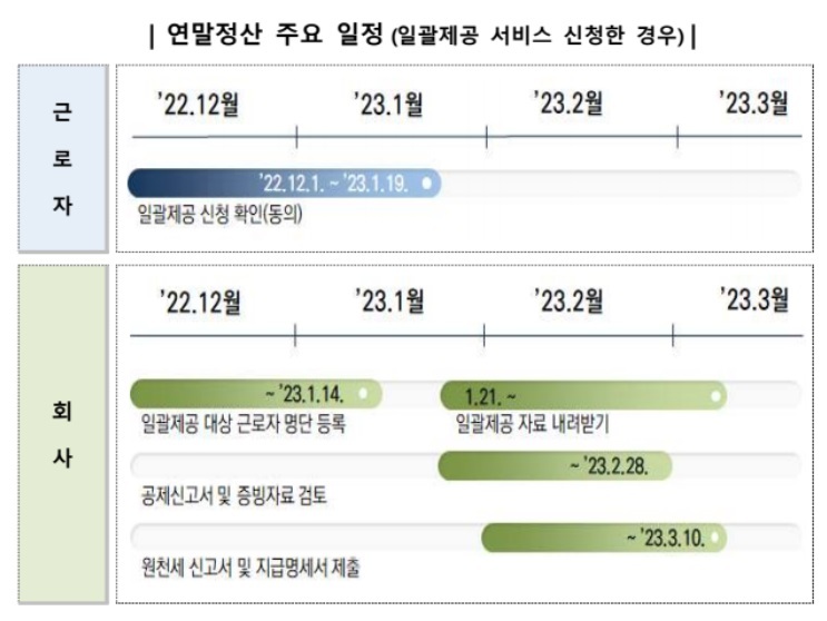 연말정산의 일정에서 근로자는 23.1.19일까지 일괄제공서비스인 경우에는 자료등록을 완료하여야 합니다.