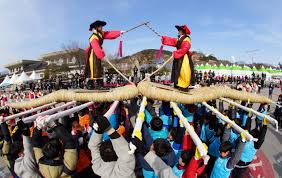 정월대보름에는 어린아이부터 노인까지 남녀노소 모두 줄다리기를 했습니다 이때 사용한 줄다리기는 오늘날의 얇은 출과 달리 가을에 거둬들인 벼에 곡식을 털어내고 남은 줄기를 모아 마을 사람들이 함께 줄을 만들어 매우 두껍고 길었다고 합니다. 우리 선조들은 줄다리기가 끝난후 줄을 썰어 논에 거름으로 사용했습니다. 이렇게 하면 농작물이 병에 들지 않고 풍년이 든다고 믿었습니다.어느지방에서는 이긴 쪽 줄을 잘라 집으로 가져 가기도 했다고 합니다. 이는 이긴 쪽의 출이 집안에 평안과 풍년을 가져올 것이라 믿었기 때문입니다.