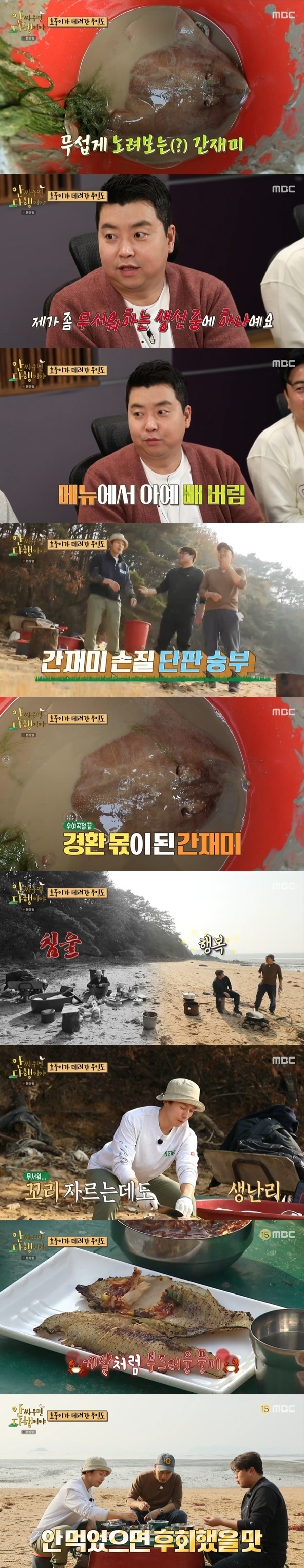 김호중은 “어른들 말씀 틀린 게 없다. 못생긴 생선일수록 맛있다고 하지 않냐”고 간재미 맛을 평했다. 그렇게 식사에 만족한 세 사람은 노래하고 춤추며 “바로 이 맛 아닙니까” 개그까지 흥을 나눴다