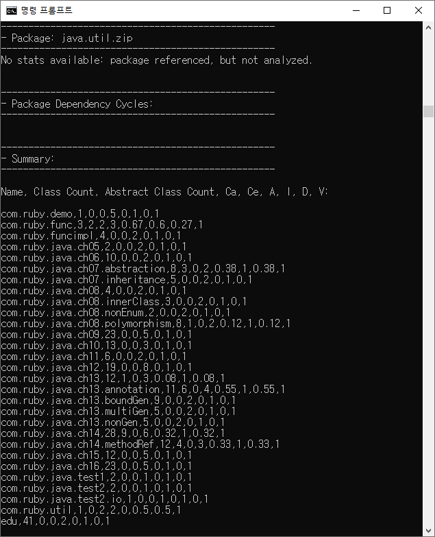 - 클래스 및 인터페이스 수(CC)패키지의 구체적인 클래스와 추상 클래스(및 인터페이스)의 수는 패키지의 확장성을 나타내는 지표입니다.
