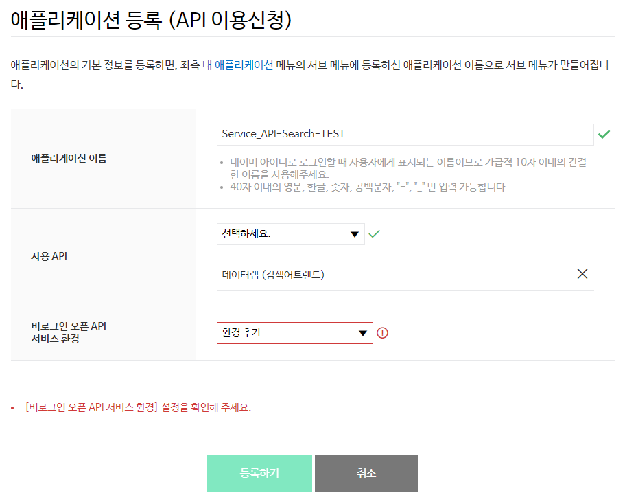 - 애플리케이션 등록 (API이용신청) 페이지에서 애플리케이션 등록 세부 정보를 입력한 다음 등록하기를 클릭합니다.
