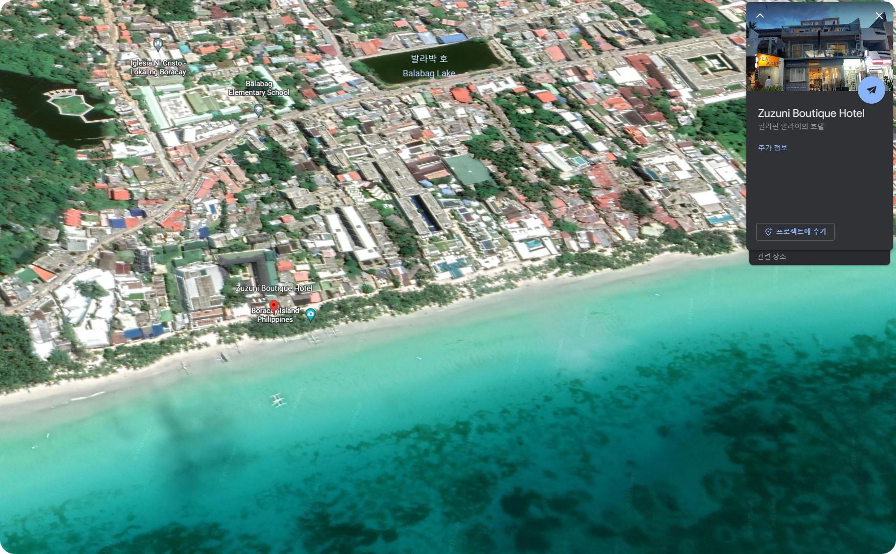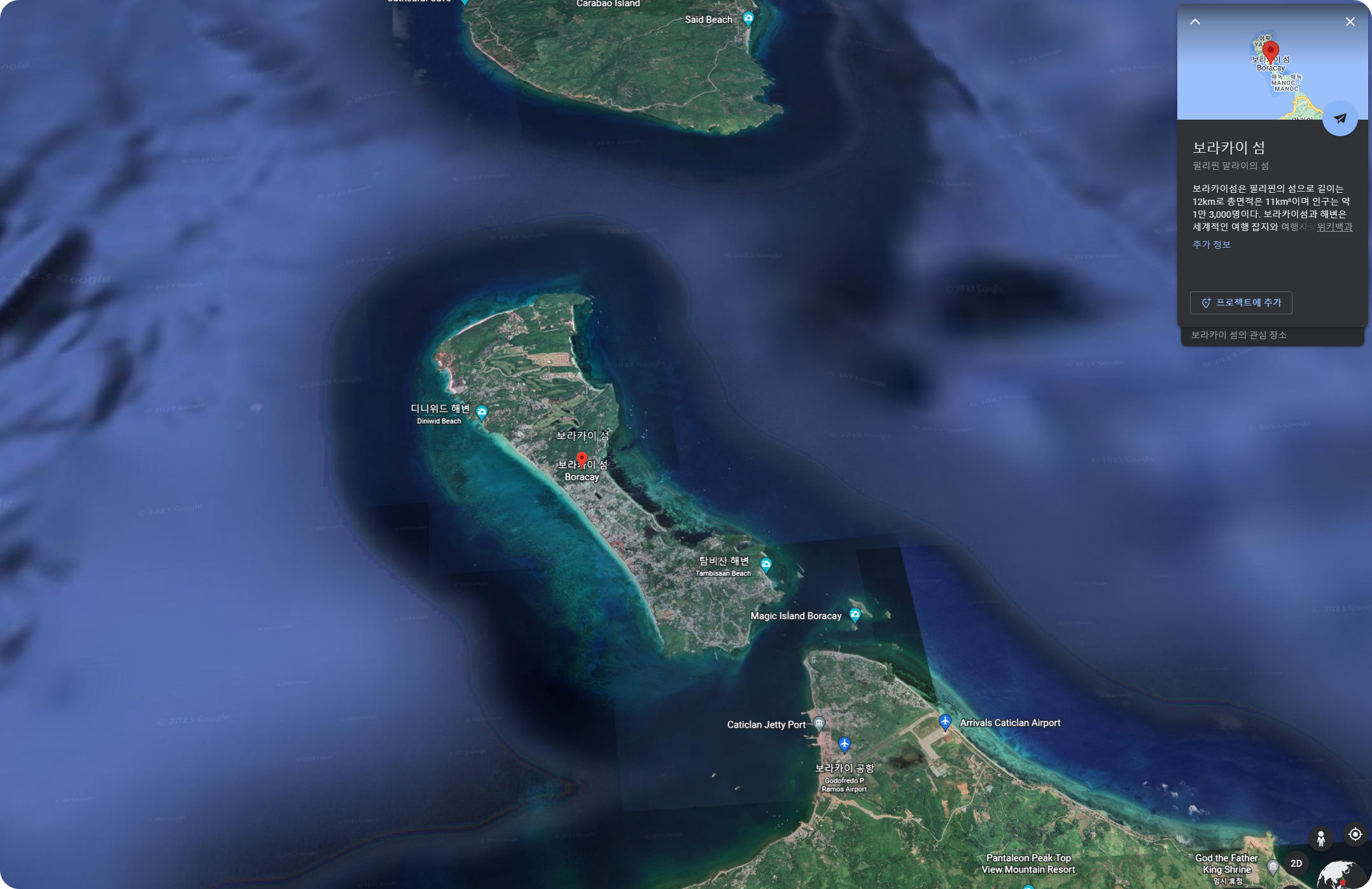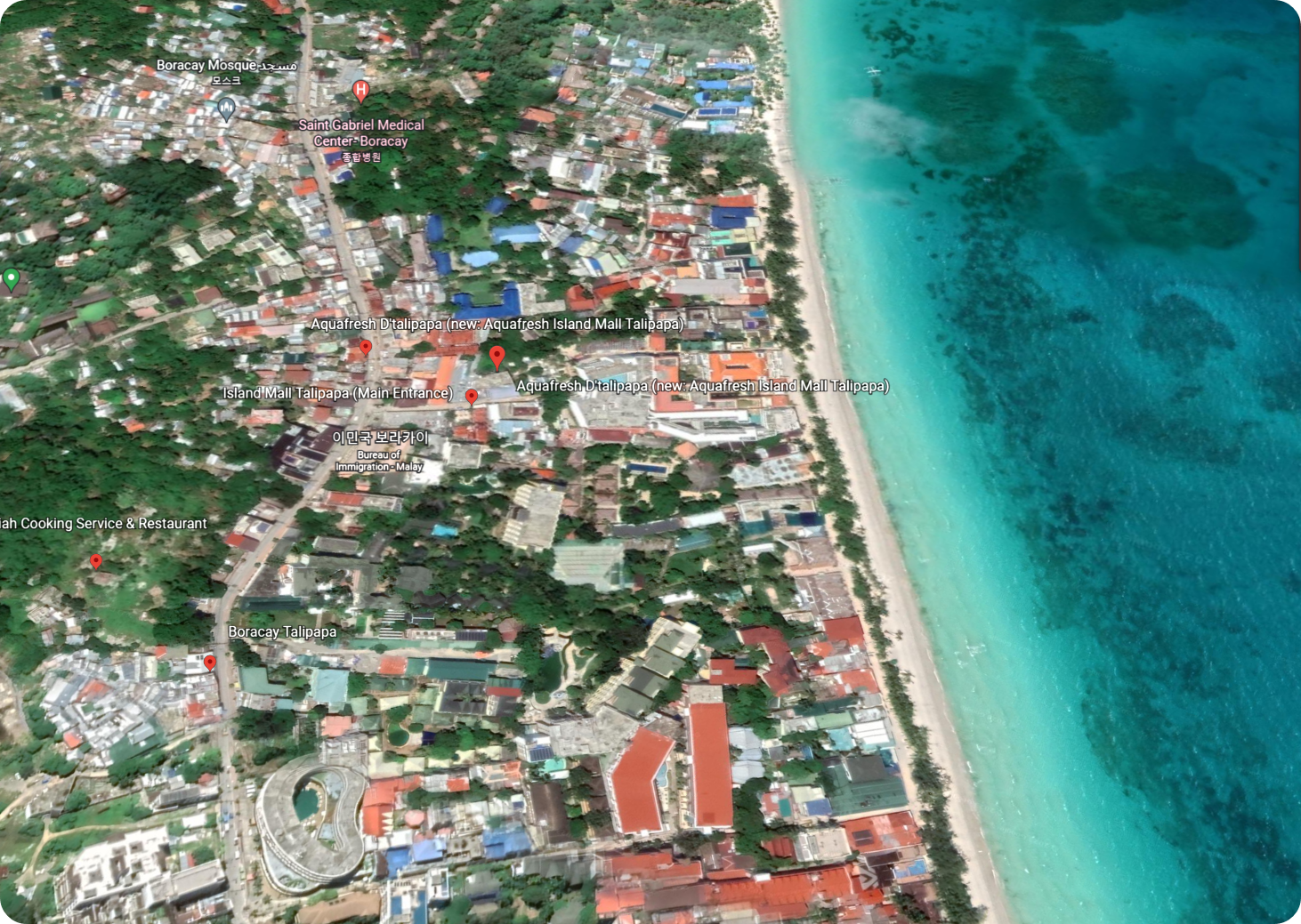 보라카이는 필리핀의 중서부 파나이섬(Panay province) 북서쪽에 떠 있는 섬으로 마지막 남은 천국이라 불릴 만큼 때묻지 않은 자연을 지닌 휴양지입니다. 이곳에는 길이 7km에 달하는 길고 넓은 화이트 비치와 야자수 숲이 어우러진 32개의 크고 작은 독특한 매력을 지닌 비치가 있습니다. 보라카이에서는 자연 경관과 조화를 이룬 건축물을 짓기 위해 코코야자 크기 이상의 건물을 지을 수 없으며 파도가 밀려오는 지점에서 300m 이내에도 건물을 지을 수 없다고 합니다.