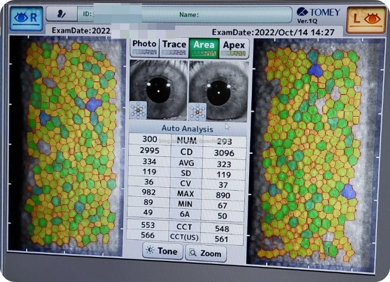 각막내피 세포의 숫자, 형태 비율 등을 알아보는 검사입니다. 각막내피 세포는 각막의 수분을 조절하는 중요한 단일 세포층으로 나이가 들어 세포 수가 감소할 경우 부종이 생기고 각막의 투명도가 떨어집니다.