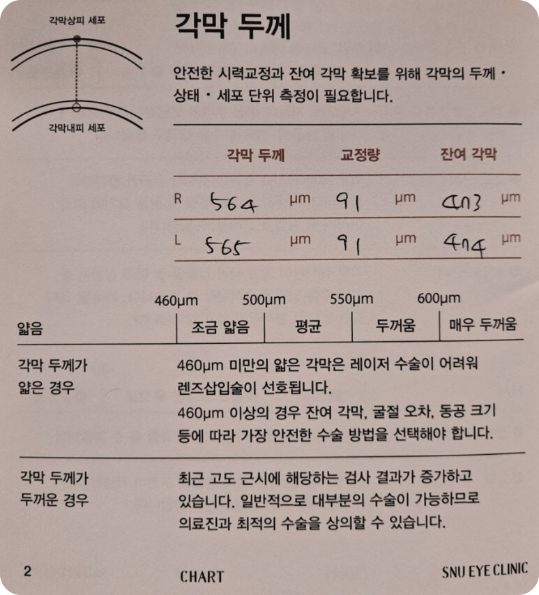 각막두께: 564um / 교정량: 91um / 잔여 각막 473um